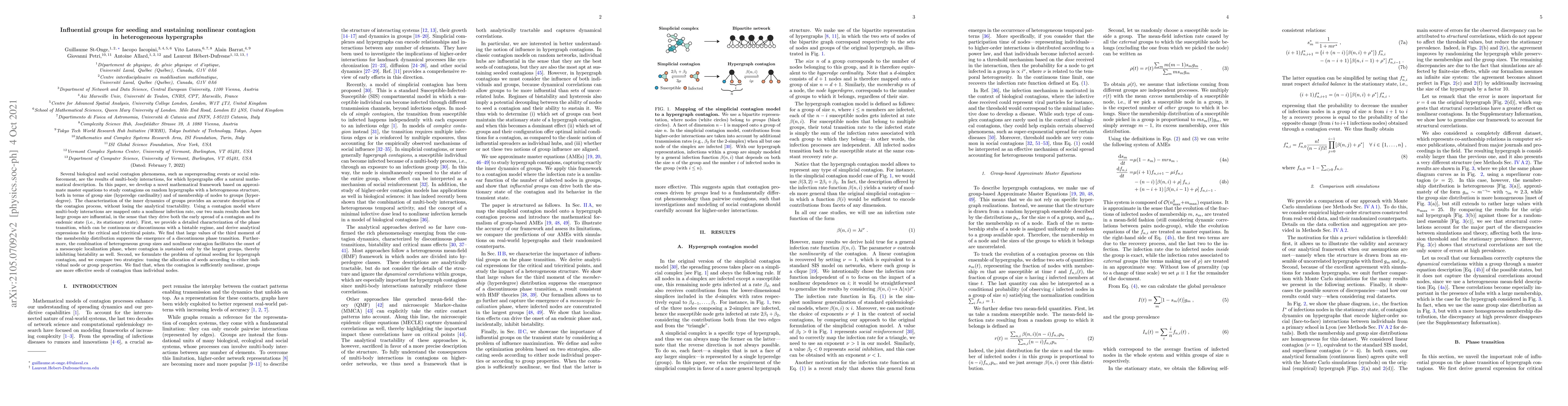 Several biological and social contagion phenomena, such as superspreading events or social reinforcement, are the results of multi-body interactions, for which hypergraphs offer a natural mathematical description. In this paper, we develop a novel mathematical framework based on approximate master equations to study contagions on random hypergraphs with a heterogeneous structure, both in terms of group size (hyperedge cardinality) and of membership of nodes to groups (hyperdegree). The characterization of the inner dynamics of groups provides an accurate description of the contagion process, without losing the analytical tractability. Using a contagion model where multi-body interactions are mapped onto a nonlinear infection rate, our two main results show how large groups are influential, in the sense that they drive both the early spread of a contagion and its endemic state (i.e., its stationary state). First, we provide a detailed characterization of the phase transition, which can be continuous or discontinuous with a bistable regime, and derive analytical expressions for the critical and tricritical points. We find that large values of the third moment of the membership distribution suppress the emergence of a discontinuous phase transition. Furthermore, the combination of heterogeneous group sizes and nonlinear contagion facilitates the onset of a mesoscopic localization phase, where contagion is sustained only by the largest groups, thereby inhibiting bistability as well. Second, we formulate the problem of optimal seeding for hypergraph contagion, and we compare two strategies: tuning the allocation of seeds according to either individual node or group properties. We find that, when the contagion is sufficiently nonlinear, groups are more effective seeds of contagion than individual nodes.