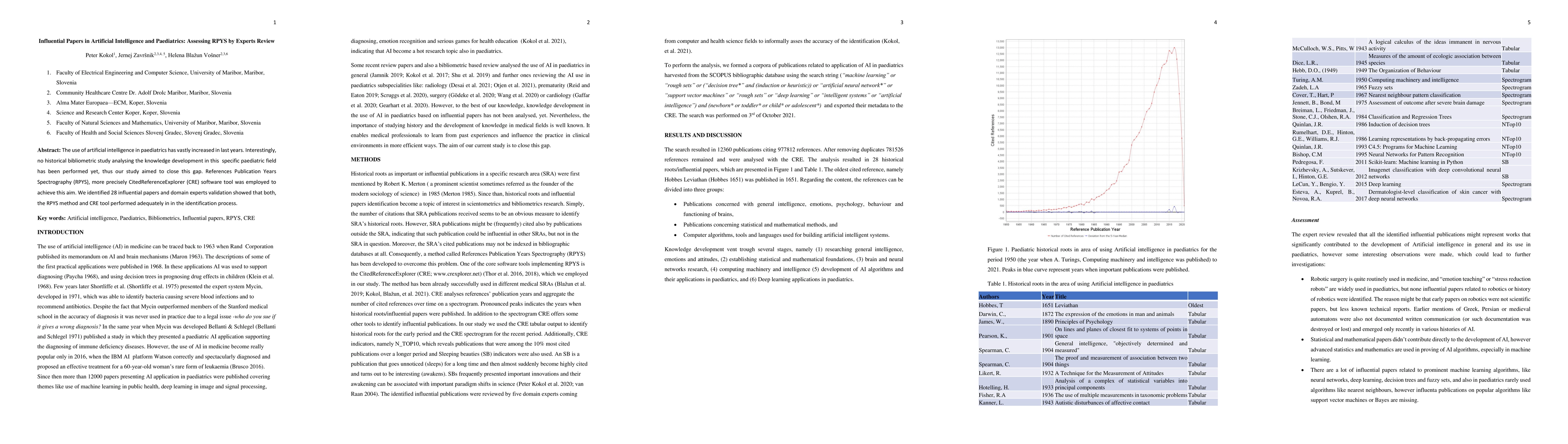 The use of artificial intelligence in paediatrics has vastly increased in the last few years. Interestingly, no historical bibliometric study analysing the knowledge development in this specific paediatric field has been performed yet, thus our study aimed to close this gap. References Publication Years Spectrography (RPYS), more precisely CitedReferenceExplorer (CRE) software tool was employed to achieve this aim. We identified 28 influential papers and domain experts validation showed that both, the RPYS method and CRE tool performed adequately in the identification process.