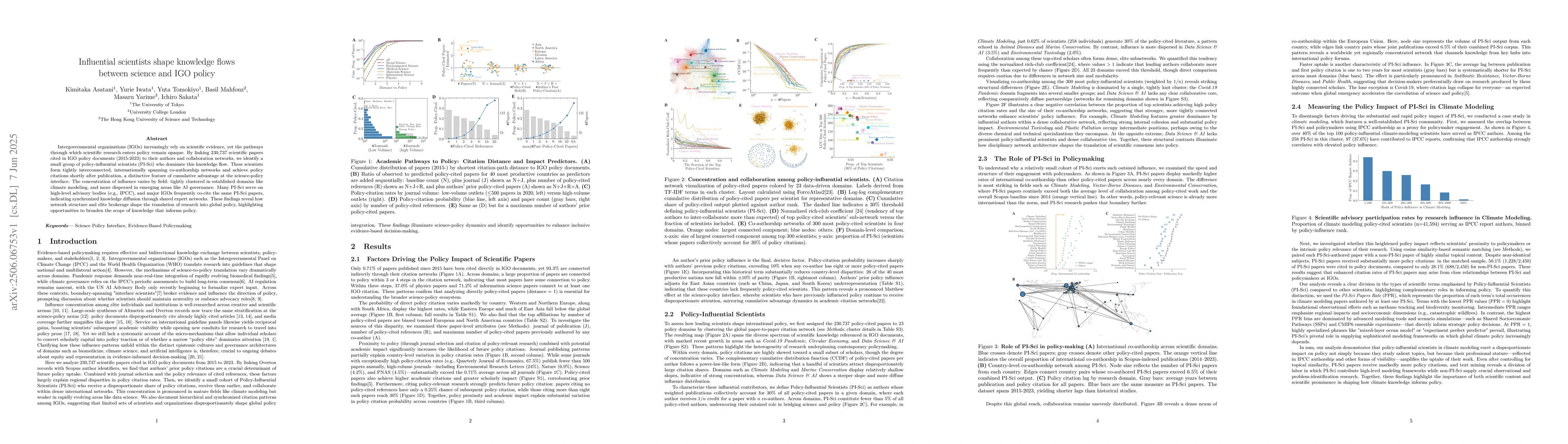 Intergovernmental organizations (IGOs) increasingly rely on scientific evidence, yet the pathways through which scientific research enters policy remain opaque. By linking 230,737 scientific papers cited in IGO policy documents (2015-2023) to their authors and collaboration networks, we identify a small group of policy-influential scientists (PI-Sci) who dominate this knowledge flow. These scientists form tightly interconnected, internationally spanning co-authorship networks and achieve policy citations shortly after publication, a distinctive feature of cumulative advantage at the science-policy interface. The concentration of influence varies by field: tightly clustered in established domains like climate modeling, and more dispersed in emerging areas like AI governance. Many PI-Sci serve on high-level advisory bodies (e.g., IPCC), and major IGOs frequently co-cite the same PI-Sci papers, indicating synchronized knowledge diffusion through shared expert networks. These findings reveal how network structure and elite brokerage shape the translation of research into global policy, highlighting opportunities to broaden the scope of knowledge that informs policy.