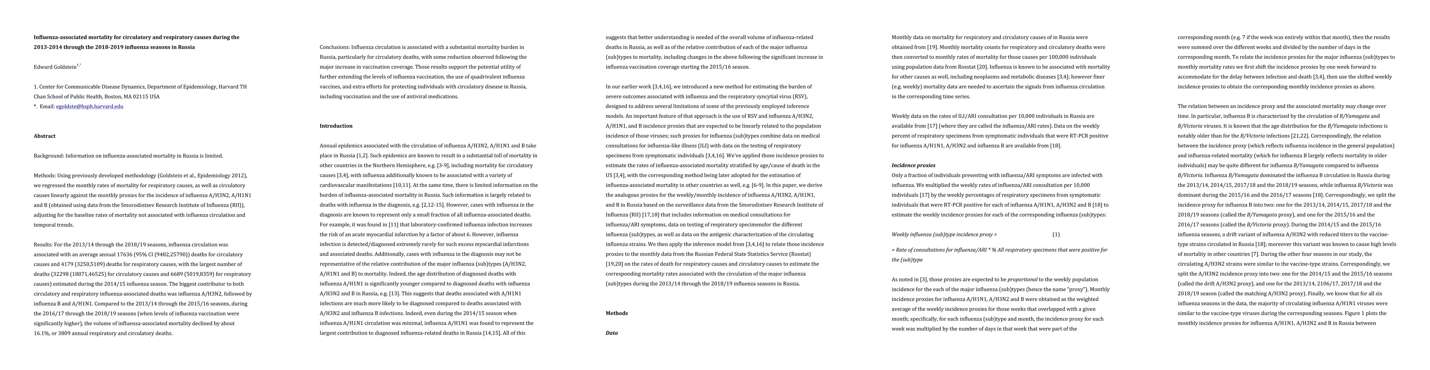 Influenza A/H3N2 was associated with 16,736 circulatory deaths and 4,179 respiratory deaths per year in Russia from 2013-2019. Vaccination coverage increased by 16% resulting in a 3809 annual decrease in influenza-associated mortality.