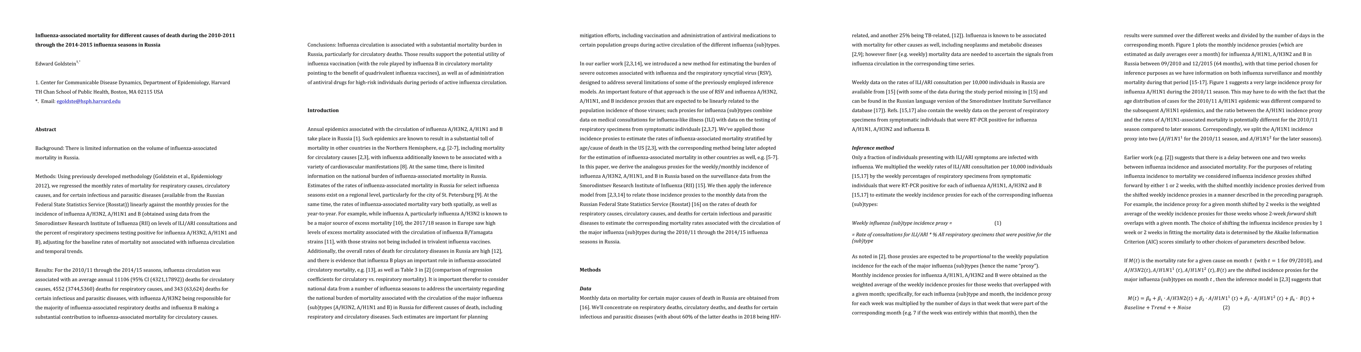 Background: There is limited information on the volume of influenza-associated mortality in Russia. Methods: Using previously developed methodology (Goldstein et al., Epidemiology 2012), we regressed the monthly rates of mortality for respiratory causes, circulatory causes, and for certain infectious and parasitic diseases (available from the Russian Federal State Statistics Service (Rosstat)) linearly against the monthly proxies for the incidence of influenza A/H3N2, A/H1N1 and B (obtained using data from the Smorodintsev Research Institute of Influenza (RII) on levels of ILI/ARI consultations and the percent of respiratory specimens testing positive for influenza A/H3N2, A/H1N1 and B), adjusting for the baseline rates of mortality not associated with influenza circulation and temporal trends. Results: For the 2010/11 through the 2014/15 seasons, influenza circulation was associated with an average annual 11106 (95% CI (4321,17892)) deaths for circulatory causes, 4552 (3744,5360) deaths for respiratory causes, and 343 (63,624) deaths for certain infectious and parasitic diseases, with influenza A/H3N2 being responsible for the majority of influenza-associated respiratory deaths and influenza B making a substantial contribution to influenza-associated mortality for circulatory causes. Conclusions: Influenza circulation is associated with a substantial mortality burden in Russia, particularly for circulatory deaths. Those results support the potential utility of influenza vaccination (with the role played by influenza B in circulatory mortality pointing to the benefit of quadrivalent influenza vaccines), as well as of administration of antiviral drugs for high-risk individuals during periods of active influenza circulation.