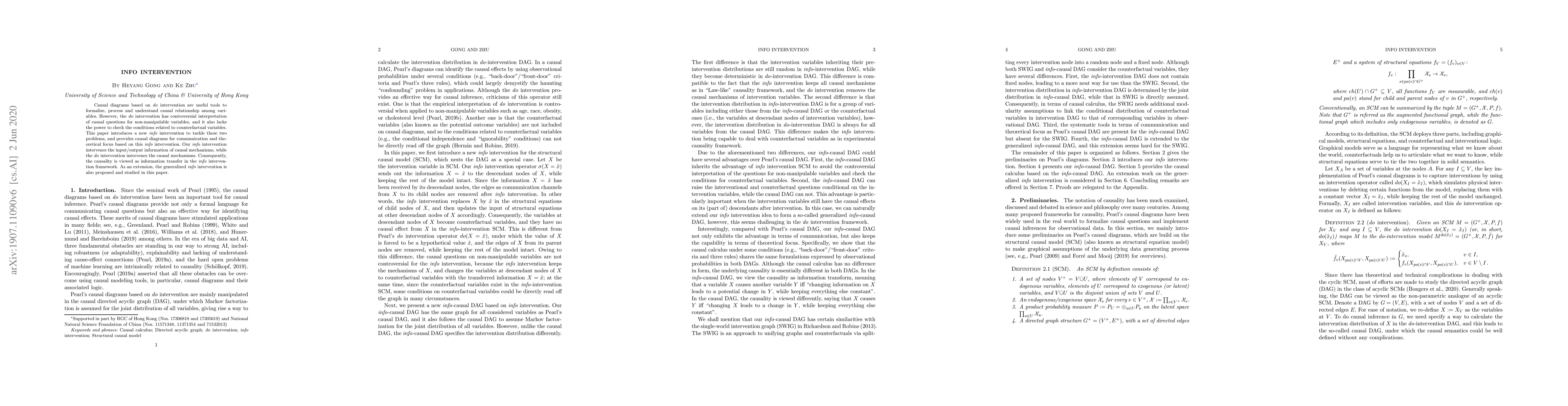 Causal diagrams based on do intervention are useful tools to formalize, process and understand causal relationship among variables. However, the do intervention has controversial interpretation of causal questions for non-manipulable variables, and it also lacks the power to check the conditions related to counterfactual variables. This paper introduces a new info intervention to tackle these two problems, and provides causal diagrams for communication and theoretical focus based on this info intervention. Our info intervention intervenes the input/output information of causal mechanisms, while the do intervention intervenes the causal mechanisms. Consequently, the causality is viewed as information transfer in the info intervention framework. As an extension, the generalized info intervention is also proposed and studied in this paper.