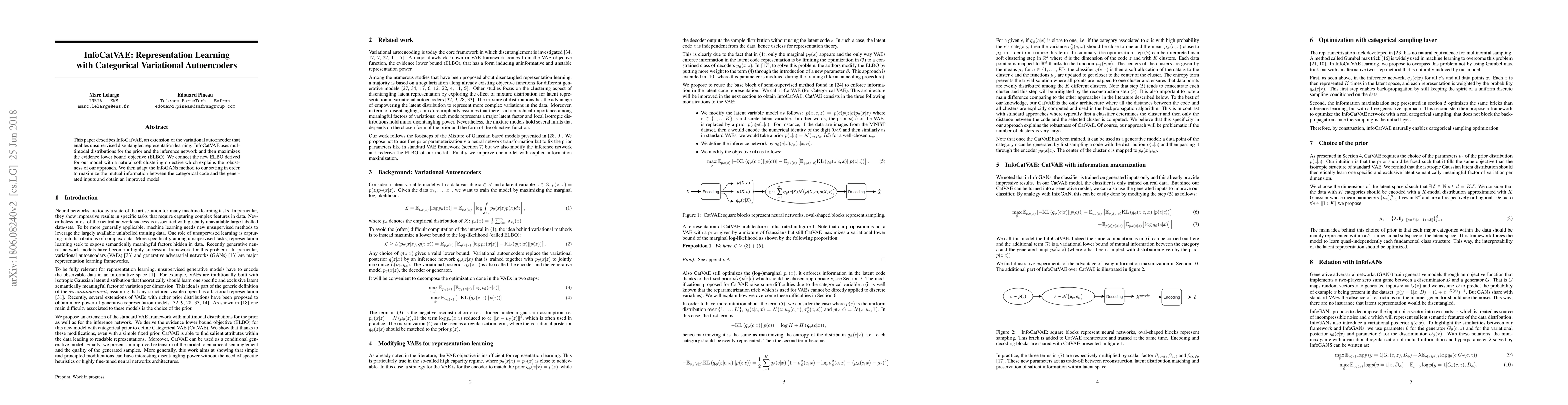 InfoCatVAE extends variational autoencoders to enable unsupervised disentangled representation learning through multimodal distributions and a modified ELBO objective, which aligns with a soft clustering approach, enhancing robustness and mutual information between categorical codes and generated inputs.