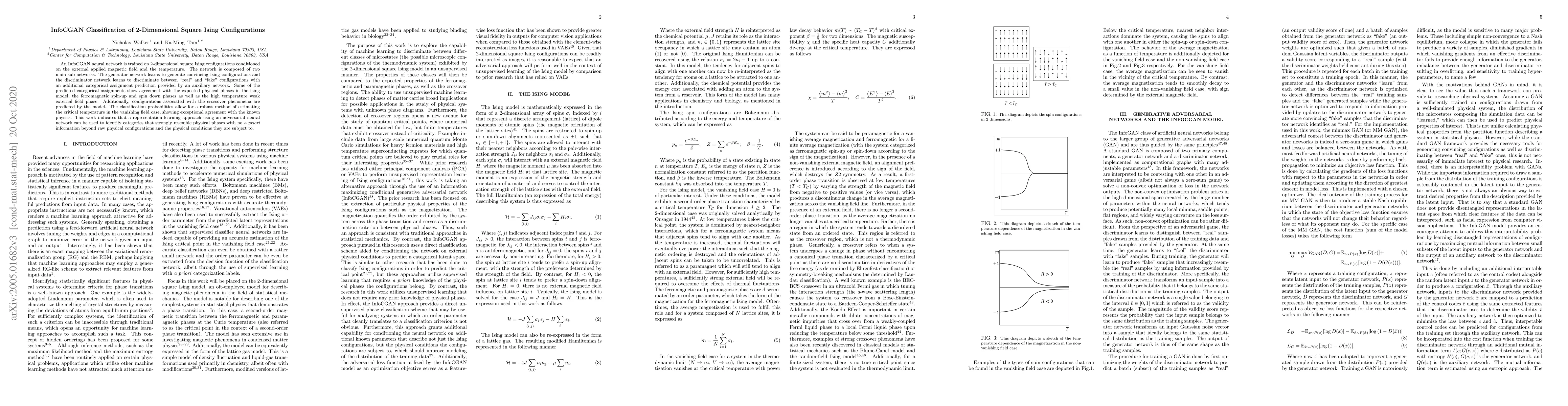 This research introduces InfoCGAN, a neural network trained on 2D Ising model configurations under magnetic field and temperature. InfoCGAN, comprising a generator and discriminator, identifies physical phases like ferromagnetic and high-temperature phases, even predicting crossover phenomena. Its classification probabilities accurately estimate critical temperatures, demonstrating that adversarial neural networks can classify physical phases from raw configurations without prior knowledge.