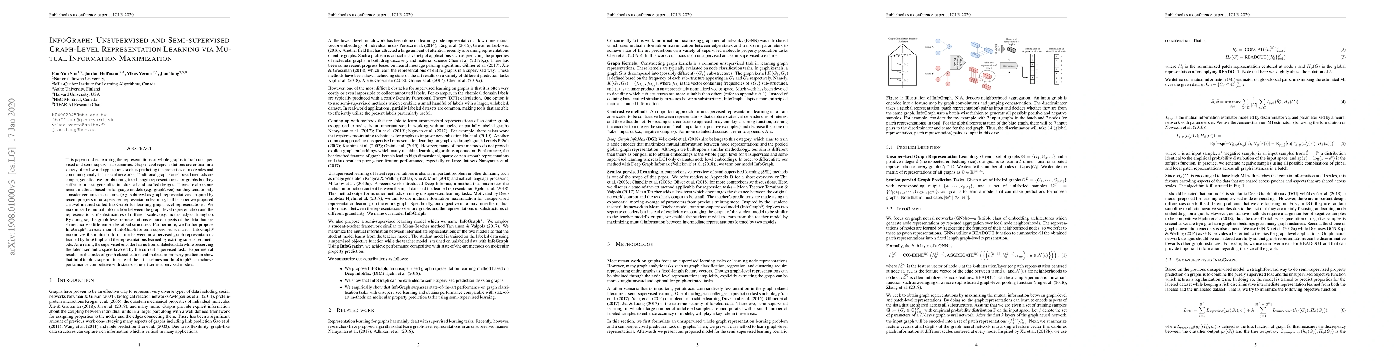 This paper proposes InfoGraph, a method for learning graph-level representations via mutual information maximization between graph-level and substructure-level representations, and InfoGraph*, its semi-supervised extension. Both methods outperform state-of-the-art baselines on graph classification and molecular property prediction tasks.