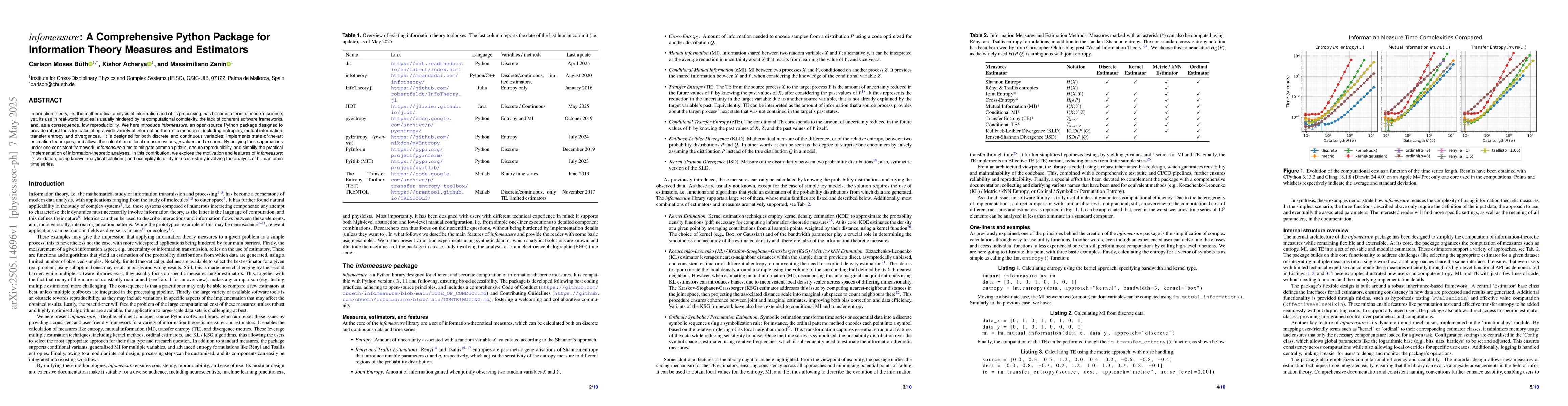 The research introduces infomeasure, a Python package for calculating various information-theoretic measures, including entropies, mutual information, transfer entropy, and divergences. It supports both discrete and continuous variables, implements state-of-the-art estimation techniques, and allows calculation of local measure values, p-values, and t-scores.