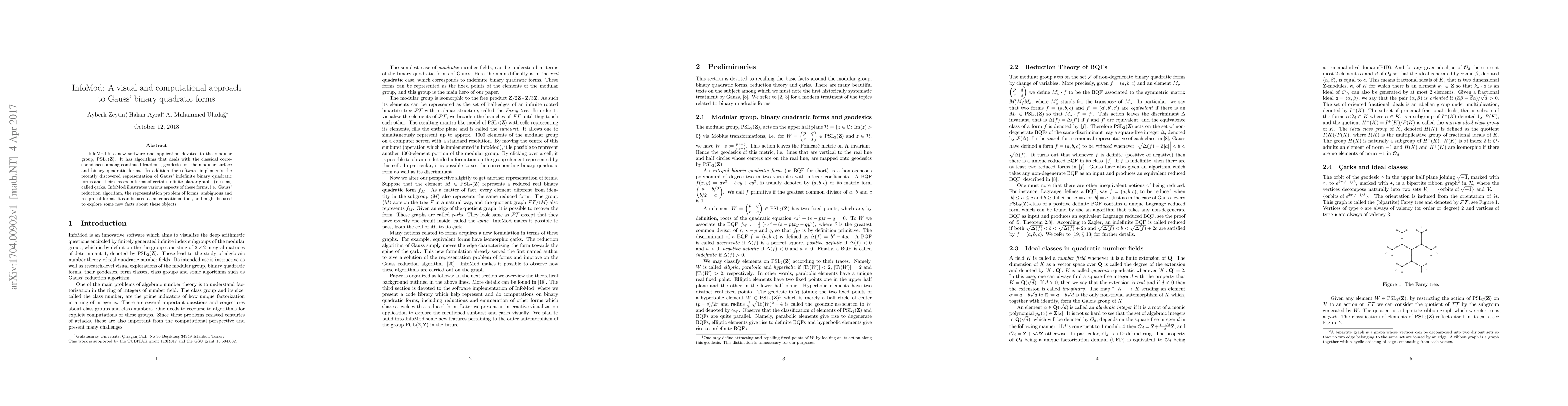 InfoMod is a novel software tool for studying the modular group PSL2(Z), implementing algorithms for continued fractions, geodesics, and binary quadratic forms, and visualizing their classes through \c{c}arks. It serves both educational purposes and potential research into new properties of these mathematical objects.