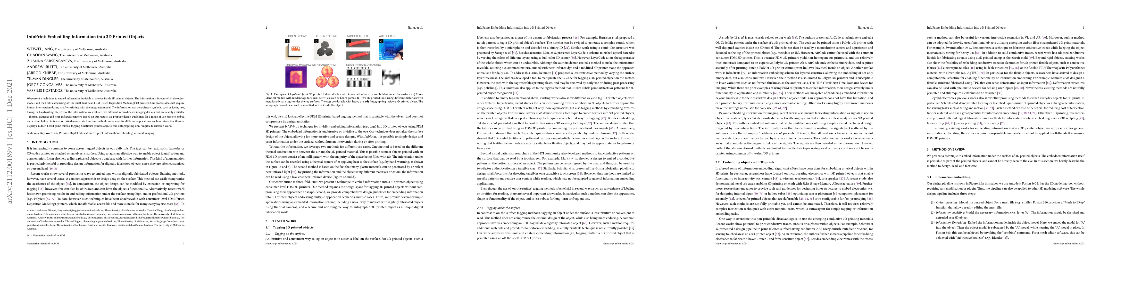 This paper introduces a technique for embedding invisible information within 3D printed objects using FDM printers, retrieving it via infrared imaging. The method supports various data types and proposes design guidelines for diverse applications like interactive displays and hidden tokens.