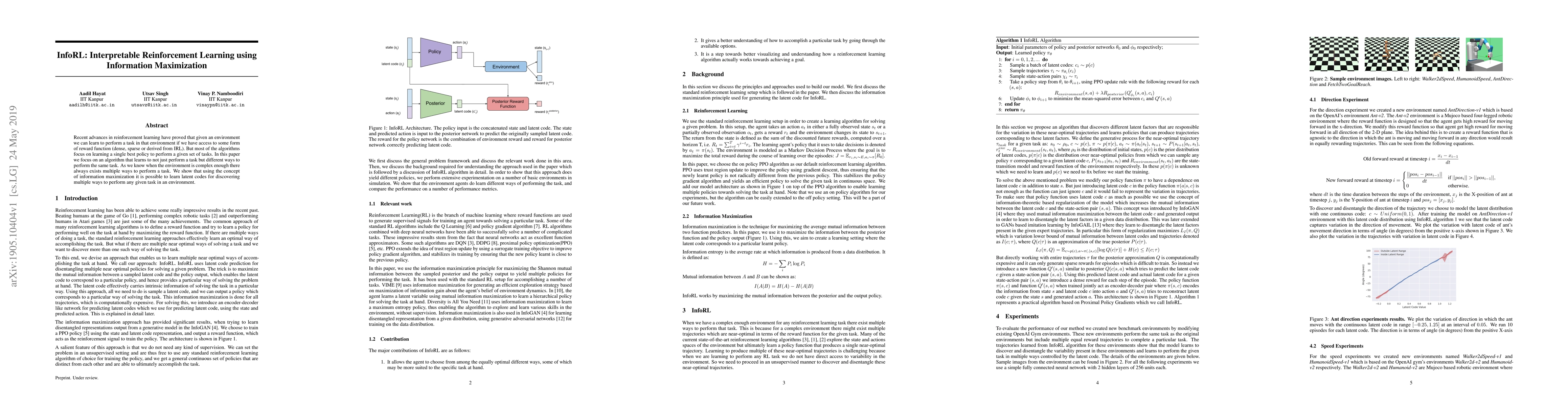 This paper proposes InfoRL, an interpretable reinforcement learning algorithm that maximizes information to discover multiple strategies for performing tasks in complex environments. By leveraging information maximization, it learns latent codes to uncover diverse ways to achieve the same objective.