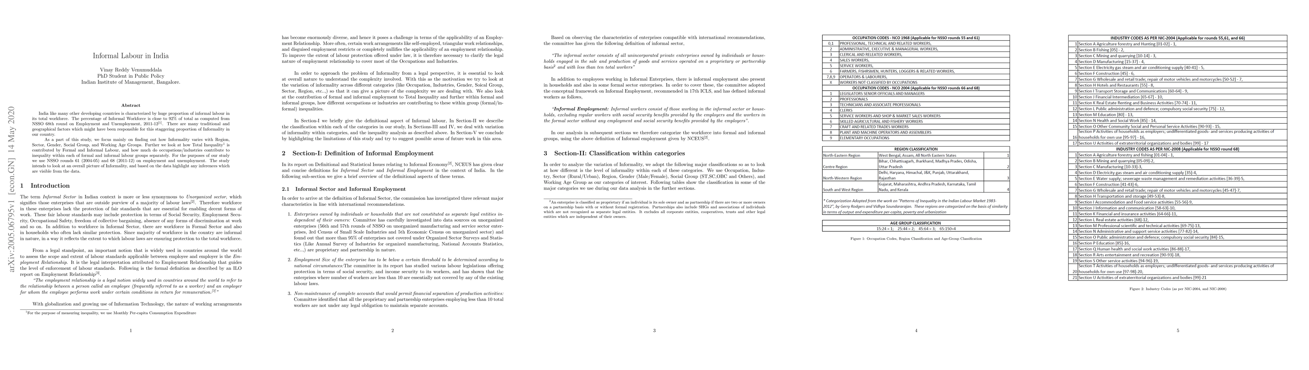 India like many other developing countries is characterized by huge proportion of informal labour in its total workforce. The percentage of Informal Workforce is close to 92% of total as computed from NSSO 68th round on Employment and Unemployment, 2011-12. There are many traditional and geographical factors which might have been responsible for this staggering proportion of Informality in our country. As a part of this study, we focus mainly on finding out how Informality varies with Region, Sector, Gender, Social Group, and Working Age Groups. Further we look at how Total Inequality is contributed by Formal and Informal Labour, and how much do occupations/industries contribute to inequality within each of formal and informal labour groups separately. For the purposes of our study we use NSSO rounds 61 (2004-05) and 68 (2011-12) on employment and unemployment. The study intends to look at an overall picture of Informality, and based on the data highlight any inferences which are visible from the data.
