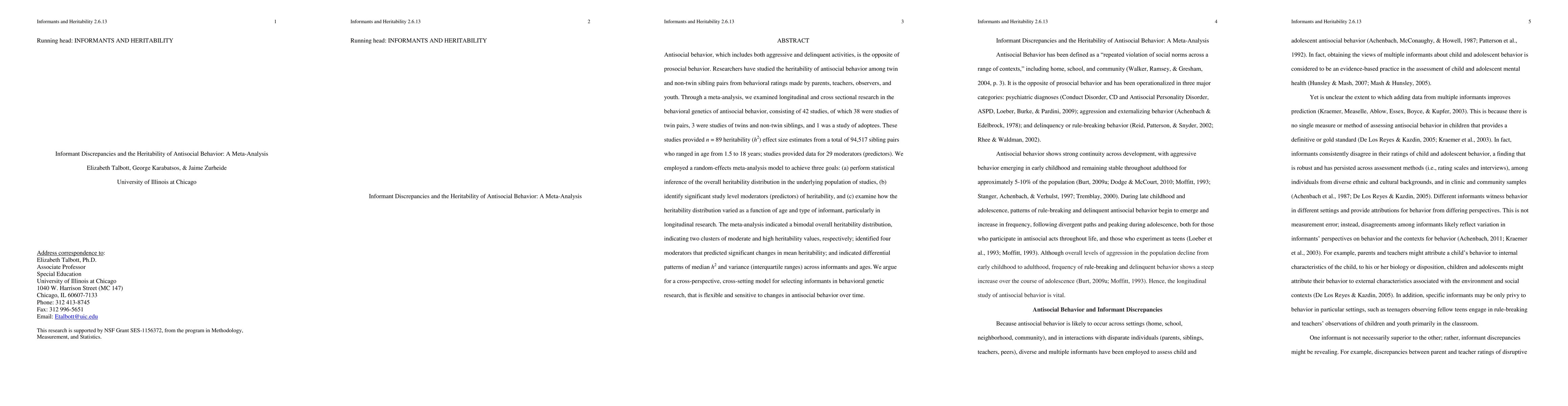 Antisocial behavior, which includes both aggressive and delinquent activities, is the opposite of prosocial behavior. Researchers have studied the heritability of antisocial behavior among twin and non-twin sibling pairs from behavioral ratings made by parents, teachers, observers, and youth. Through a meta-analysis, we examined longitudinal and cross sectional research in the behavioral genetics of antisocial behavior, consisting of 42 studies, of which 38 were studies of twin pairs, 3 were studies of twins and non-twin siblings, and 1 was a study of adoptees. These studies provided n = 89 heritability (h2) effect size estimates from a total of 94,517 sibling pairs who ranged in age from 1.5 to 18 years; studies provided data for 29 moderators (predictors). We employed a random-effects meta-analysis model to achieve three goals: (a) perform statistical inference of the overall heritability distribution in the underlying population of studies, (b) identify significant study level moderators (predictors) of heritability, and (c) examine how the heritability distribution varied as a function of age and type of informant, particularly in longitudinal research. The meta-analysis indicated a bimodal overall heritability distribution, indicating two clusters of moderate and high heritability values, respectively; identified four moderators that predicted significant changes in mean heritability; and indicated differential patterns of median h2 and variance (interquartile ranges) across informants and ages. We argue for a cross-perspective, cross-setting model for selecting informants in behavioral genetic research, that is flexible and sensitive to changes in antisocial behavior over time.