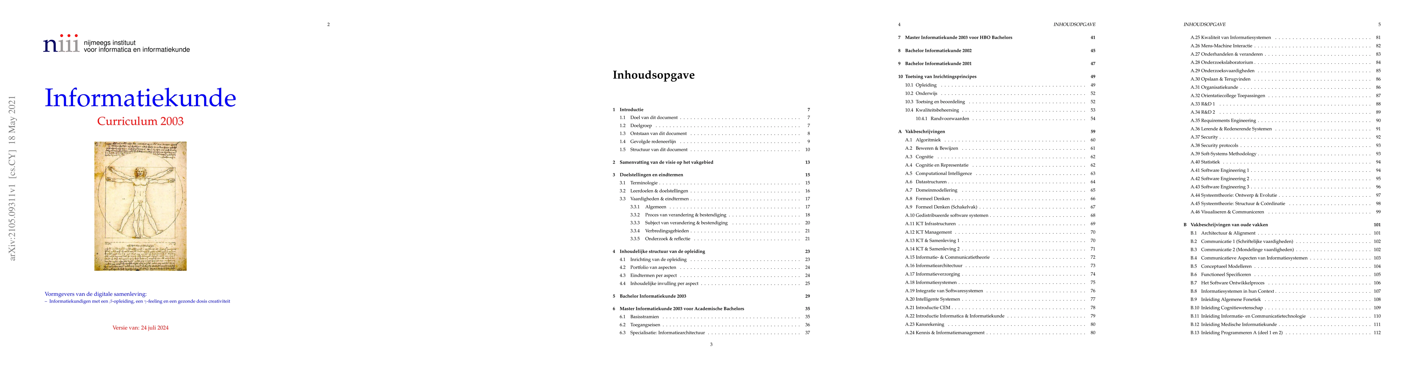 This document discusses the curriculum of the business informatics program of the Nijmegen Institute for Informatics and business informatics (NIII). The aim is to provide a 'repository' with regard to the structure of the curriculum, which will apply from 2003. In the past three years, the image of information science as a discipline has been further concretised at both national and Nijmegen level. Curriculum 2003 is on the one hand the result of this concretization and on the other hand of the three years of experience that has now been built up within the NIII with the information science training. In this document, therefore, explicit attention will also be paid to the 'migration' from the existing 'start-up' curricula: 2000, 2001 and 2002. It should be noted here that the students of cohort 2000 will in principle have completed the bachelor's phase of the program this year (2003). Complete information science education. No specific `migration 'is therefore necessary for this group of students.