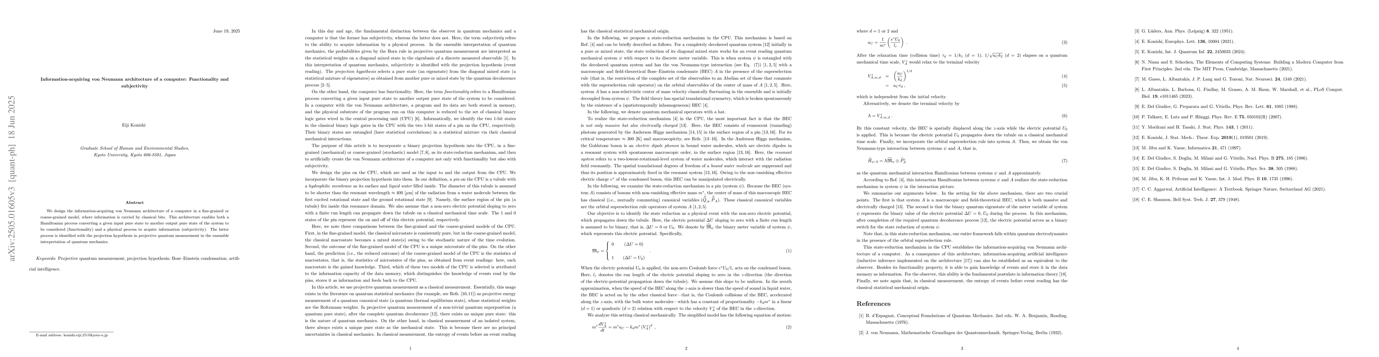The research proposes an information-acquiring von Neumann architecture of a computer, modeled in fine-grained or coarse-grained systems using classical bits. It combines Hamiltonian processes for state conversion (functionality) with physical processes for information acquisition (subjectivity), identified with the projection hypothesis in projective quantum measurements.