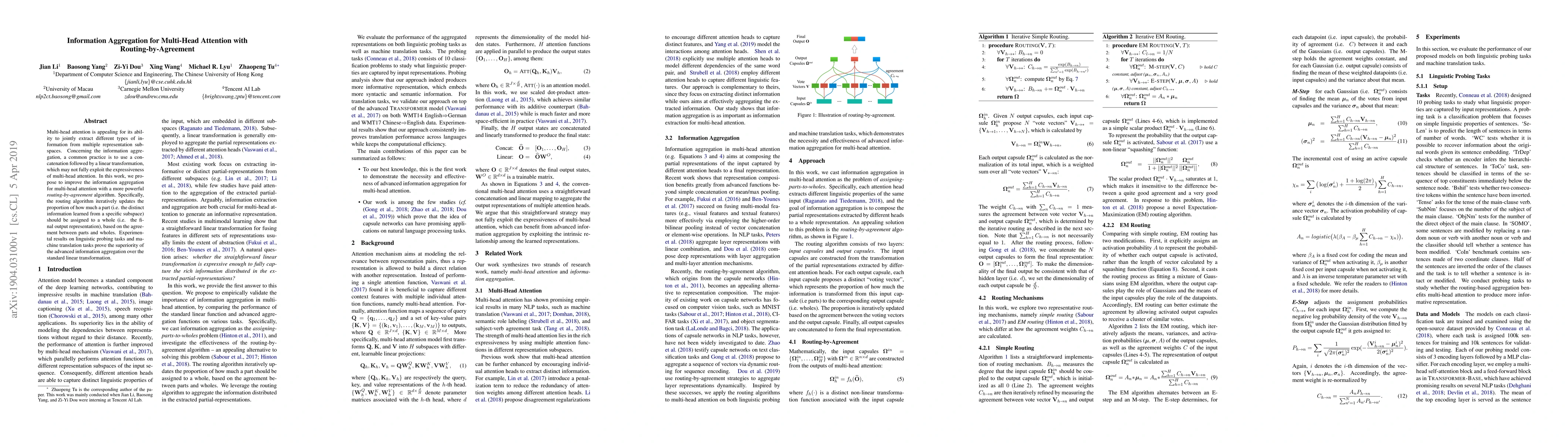 This paper proposes a routing-by-agreement algorithm to improve information aggregation in multi-head attention, which iteratively updates the contribution of distinct information subspaces based on their agreement with the final output. Experimental results show this method outperforms standard linear transformation in linguistic and machine translation tasks.