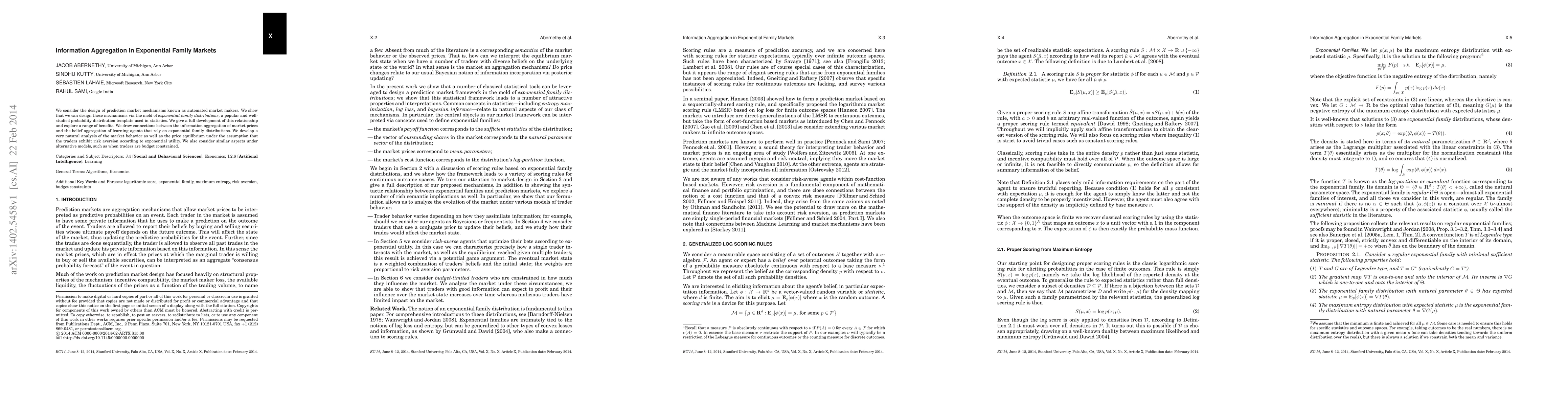 This paper designs automated market maker mechanisms using exponential family distributions, demonstrating benefits in information aggregation and price equilibrium. It explores connections between market prices and belief aggregation, analyzing market behavior under risk aversion and budget constraints.