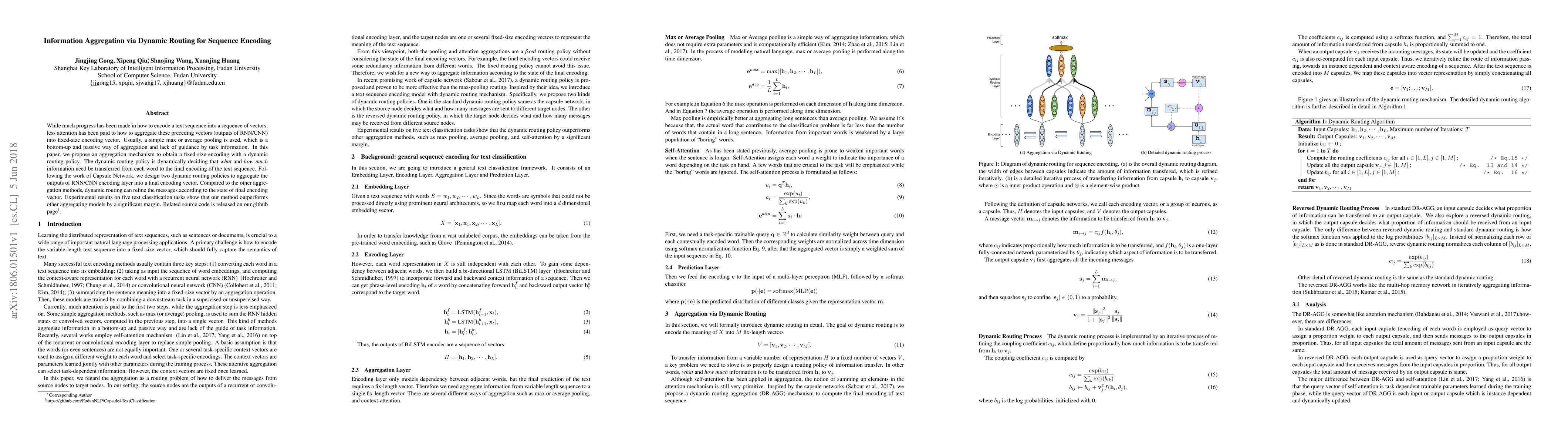 This paper proposes a dynamic routing mechanism for aggregating sequence encodings from RNN/CNN layers into a fixed-size encoding vector, outperforming traditional pooling methods. The dynamic routing policy adaptively decides information transfer based on task context, leading to superior performance on text classification tasks.