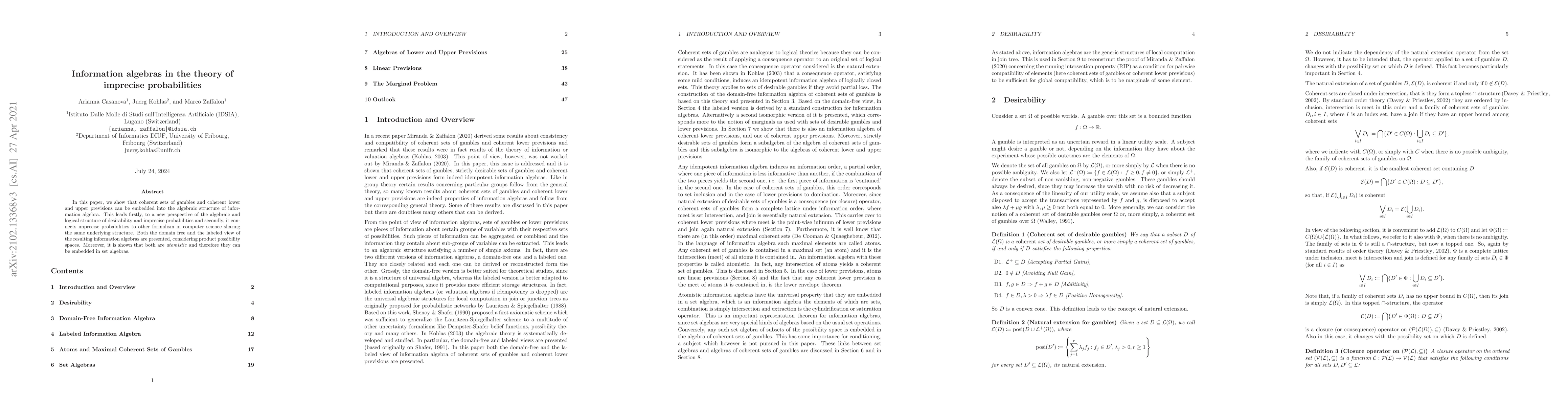 This paper embeds coherent sets of gambles and imprecise probabilities into information algebras, offering a new algebraic perspective on desirability and imprecise probabilities, and linking them to computer science formalisms. It presents both domain-free and labeled views of these algebras, demonstrating their atomistic nature and embeddability in set algebras.