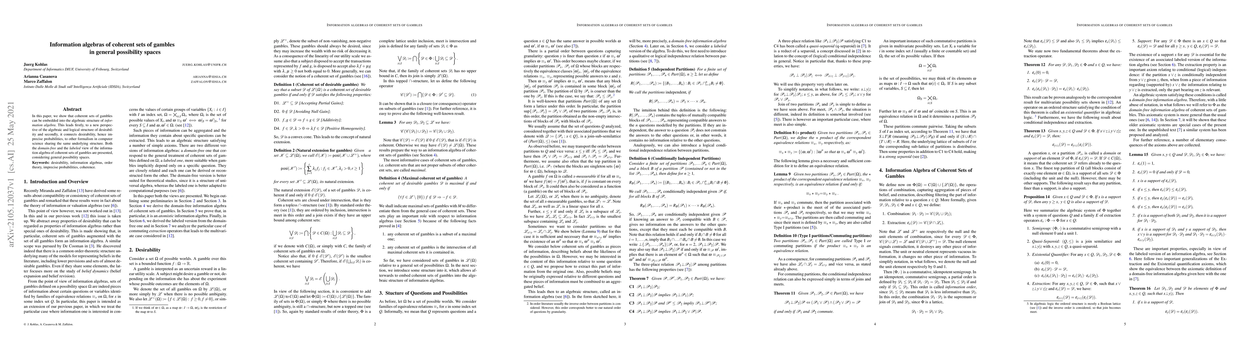 This paper demonstrates how coherent sets of gambles can be embedded into information algebras, offering new insights into the algebraic and logical structure of desirability and linking imprecise probabilities to other computer science formalisms. Both domain-free and labeled views of these algebras are explored within general possibility spaces.