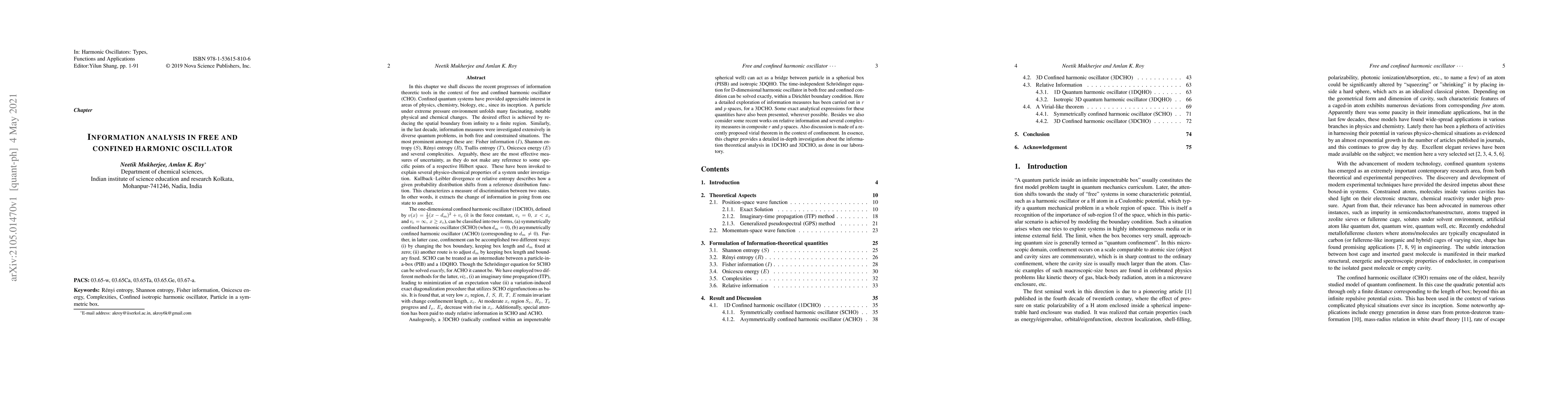 In this chapter we shall discuss the recent progresses of information theoretic tools in the context of free and confined harmonic oscillator. Confined quantum systems have provided appreciable interest in areas of physics, chemistry, biology,etc., since its inception. A particle under extreme pressure environment unfolds many fascinating, notable physical and chemical changes. The desired effect is achieved by reducing the spatial boundary from infinity to a finite region. Similarly, in the last decade, information measures were investigated extensively in diverse quantum problems, in both free and constrained situations. The most prominent amongst these are: Fisher information, Shannon entropy, Renyi entropy , Tsallis entropy, Onicescu energy and several complexities. Arguably, these are the most effective measures of uncertainty, as they do not make any reference to some specific points of a respective Hilbert space. These have been invoked to explain several physico-chemical properties of a system under investigation. Kullback-Leibler divergence or relative entropy describes how a given probability distribution shifts from a reference distribution function. This characterizes a measure of discrimination between two states. In other words, it extracts the change of information in going from one state to another.
