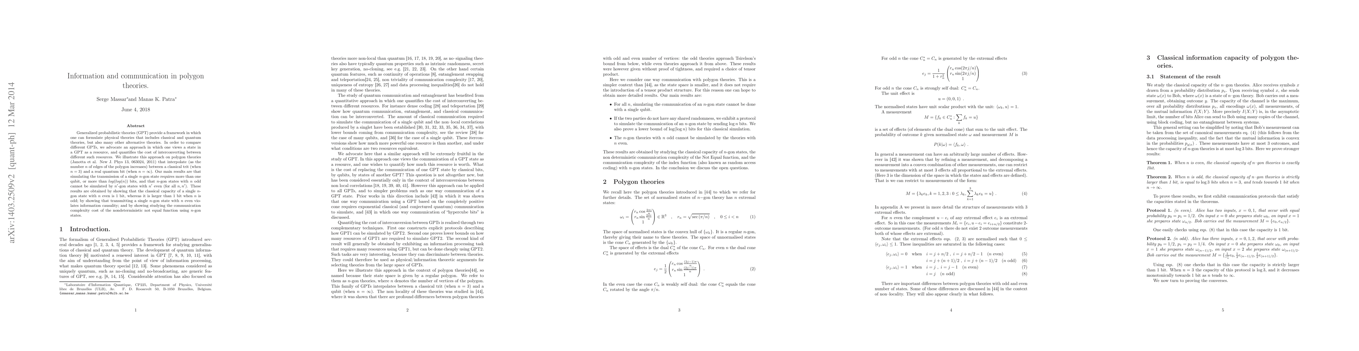 Generalized probabilistic theories (GPT) provide a framework in which one can formulate physical theories that includes classical and quantum theories, but also many other alternative theories. In order to compare different GPTs, we advocate an approach in which one views a state in a GPT as a resource, and quantifies the cost of interconverting between different such resources. We illustrate this approach on polygon theories (Janotta et al. New J. Phys 13, 063024, 2011) that interpolate (as the number n of edges of the polygon increases) between a classical trit (when n=3) and a real quantum bit (when n=infinity). Our main results are that simulating the transmission of a single n-gon state requires more than one qubit, or more than log(log(n)) bits, and that n-gon states with n odd cannot be simulated by n'-gon states with n' even (for all n,n'). These results are obtained by showing that the classical capacity of a single n-gon state with n even is 1 bit, whereas it is larger than 1 bit when n is odd; by showing that transmitting a single n-gon state with n even violates information causality; and by showing studying the communication complexity cost of the nondeterministic not equal function using n-gon states.