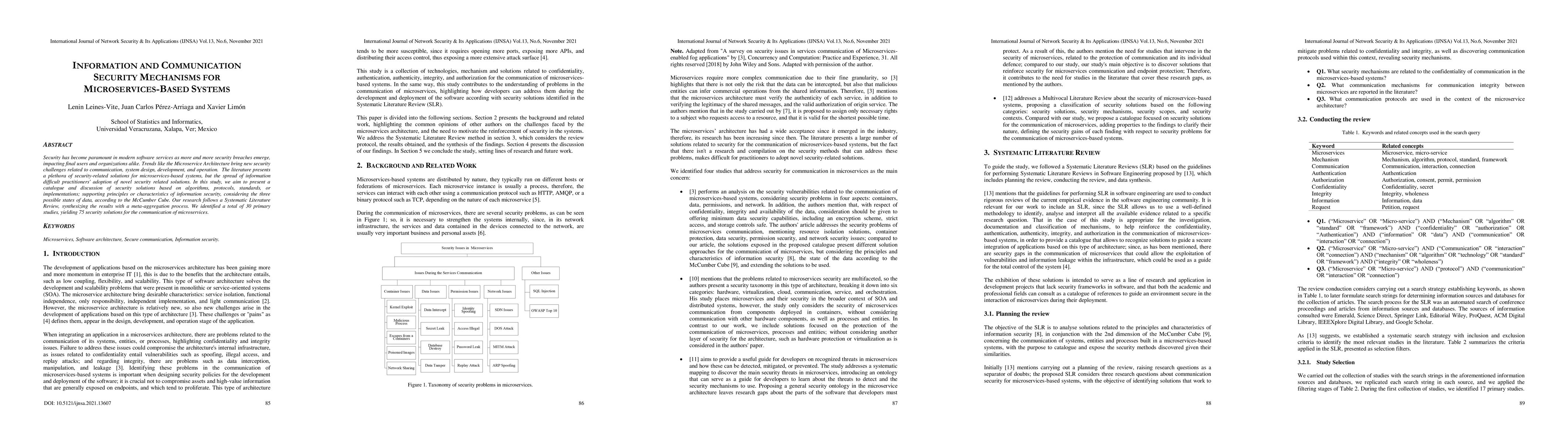 This paper conducts a Systematic Literature Review to catalog and discuss security solutions for microservices-based systems, focusing on algorithms, protocols, standards, and implementations. The study synthesizes findings to support information security principles across data states, revealing 75 security solutions for microservice communication.