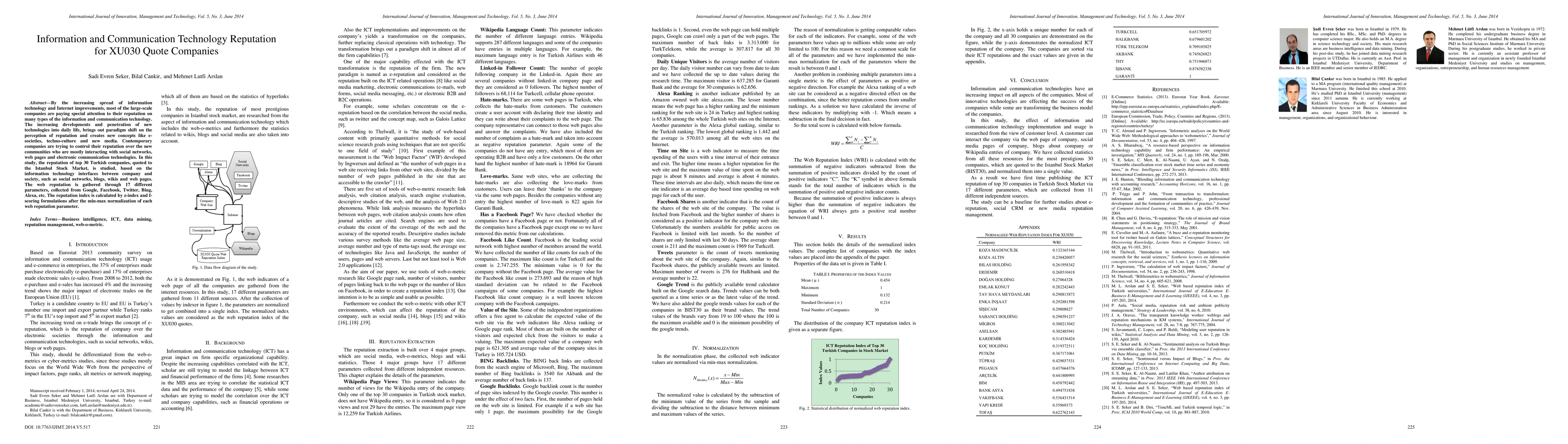 This study examines the reputation of 30 top Turkish companies based on their online presence through social networks, blogs, and web pages. It calculates a reputation index using parameters such as Google and Facebook ratings to provide insights into the impact of information technology on corporate reputation.
