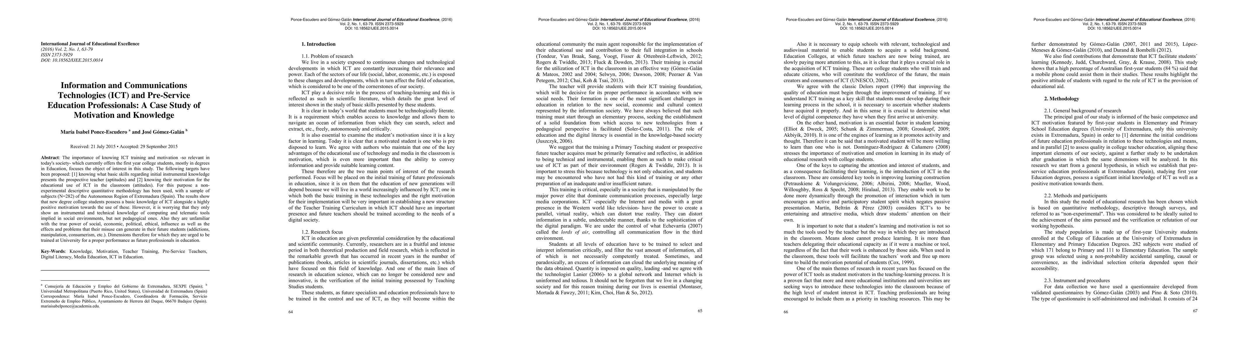 The importance of knowing ICT training and motivation -so relevant in today's society- which currently offers the first year college students, mostly in degrees in Education, focuses the object of interest in this study. The following targets have been proposed: [1] knowing what basic skills regarding initial instrumental knowledge presents the prospective teacher (aptitudes) and [2] knowing their motivation for the educational use of ICT in the classroom (attitudes). For this purpose a non-experimental descriptive quantitative methodology has been used, with a sample of subjects (N=282) of the Autonomous Region of Extremadura (Spain). The results show that new degree college students possess a basic knowledge of ICT alongside a highly positive motivation towards the use of these. However, it is worrying that they only show an instrumental and technical knowledge of computing and telematic tools implied in social environments, but not pedagogical ones. Also they are unfamiliar with the true power of social, economic, political, ethical, influence as well as the effects and problems that their misuse can generate in their future students (addictions, manipulation, consumerism, etc.). Dimensions therefore for which they are urged to be trained at University for a proper performance as future professionals in education.
