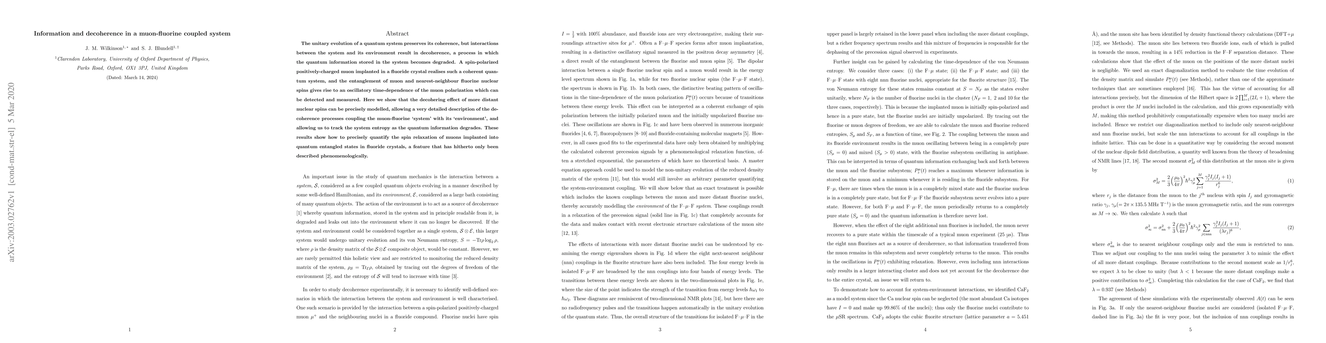 The unitary evolution of a quantum system preserves its coherence, but interactions between the system and its environment result in decoherence, a process in which the quantum information stored in the system becomes degraded. A spin-polarized positively-charged muon implanted in a fluoride crystal realises such a coherent quantum system, and the entanglement of muon and nearest-neighbour fluorine nuclear spins gives rise to an oscillatory time-dependence of the muon polarization which can be detected and measured. Here we show that the decohering effect of more distant nuclear spins can be precisely modelled, allowing a very detailed description of the decoherence processes coupling the muon-fluorine 'system' with its 'environment', and allowing us to track the system entropy as the quantum information degrades. These results show how to precisely quantify the spin relaxation of muons implanted into quantum entangled states in fluoride crystals, a feature that has hitherto only been described phenomenologically.