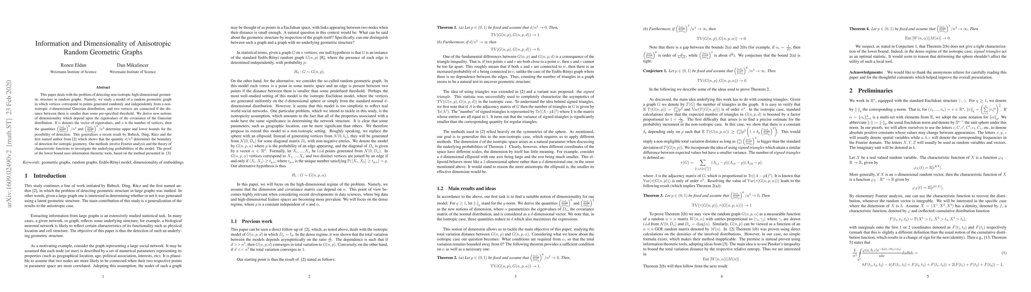 This research introduces new dimensionality notions for detecting non-isotropic high-dimensional geometric structures in random graphs. Utilizing Fourier analysis and characteristic function theory, it derives upper and lower bounds for detection possibility, generalizing previous isotropic geometry results. The lower bound is proven via information-theoretic methods.