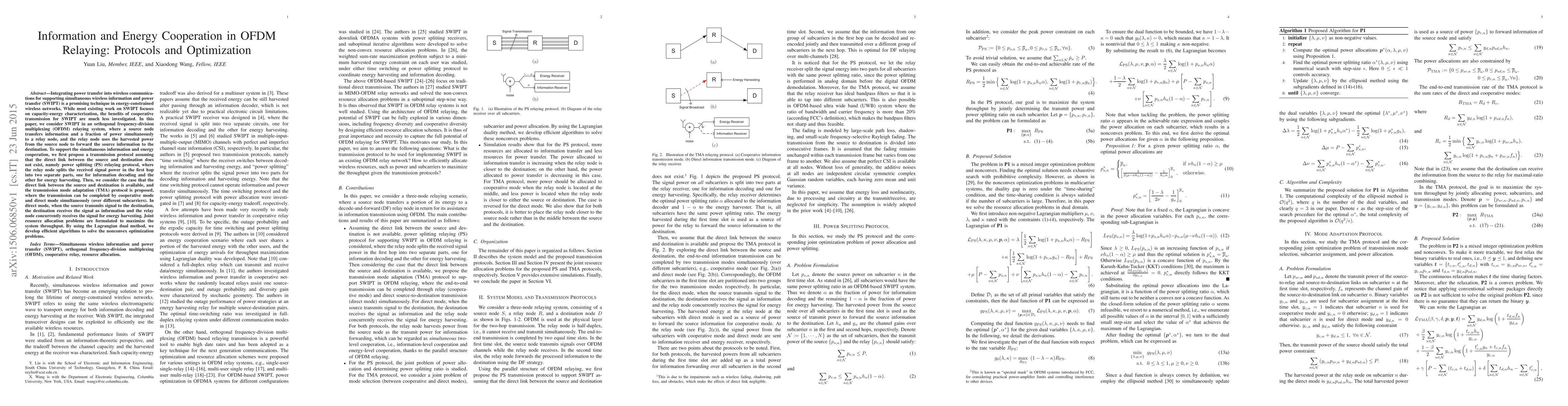 This paper investigates simultaneous wireless information and power transfer (SWIPT) in an OFDM relaying system, proposing two protocols: power splitting relaying and transmission mode adaptation. Optimization algorithms are developed to maximize system throughput by jointly allocating resources.