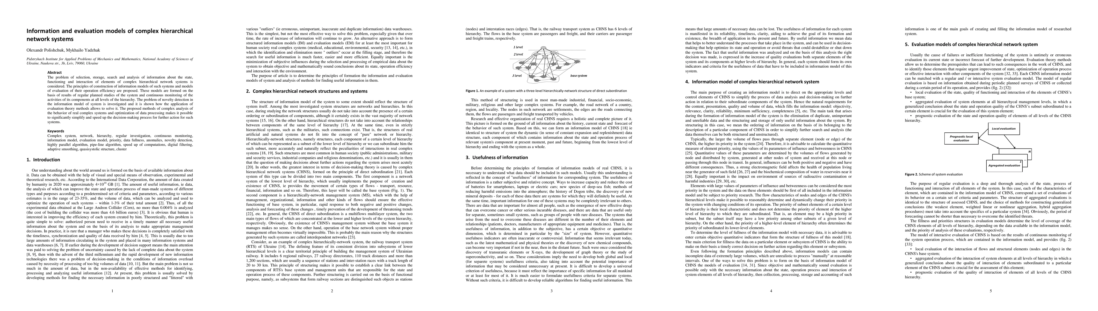 This paper proposes information and evaluation models for complex hierarchical network systems to aid in selection, storage, search, and analysis of system data. It introduces methods for assessing operational efficiency based on continuous monitoring and planned studies, and explores novel techniques for detecting changes and optimizing data processing to streamline decision-making.