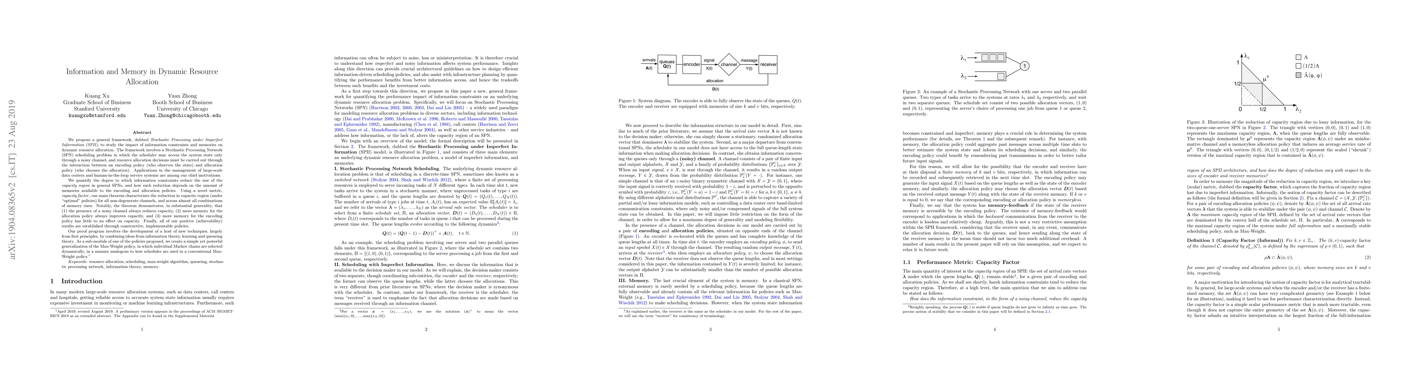We propose a general framework, dubbed Stochastic Processing under Imperfect Information (SPII), to study the impact of information constraints and memories on dynamic resource allocation. The framework involves a Stochastic Processing Network (SPN) scheduling problem in which the scheduler may access the system state only through a noisy channel, and resource allocation decisions must be carried out through the interaction between an encoding policy (who observes the state) and allocation policy (who chooses the allocation). Applications in the management of large-scale data centers and human-in-the-loop service systems are among our chief motivations. We quantify the degree to which information constraints reduce the size of the capacity region in general SPNs, and how such reduction depends on the amount of memories available to the encoding and allocation policies. Using a novel metric, capacity factor, our main theorem characterizes the reduction in capacity region (under "optimal" policies) for all non-degenerate channels, and across almost all combinations of memory sizes. Notably, the theorem demonstrates, in substantial generality, that (1) the presence of a noisy channel always reduces capacity, (2) more memory for the allocation policy always improves capacity, and (3) more memory for the encoding policy has little to no effect on capacity. Finally, all of our positive (achievability) results are established through constructive, implementable policies.
