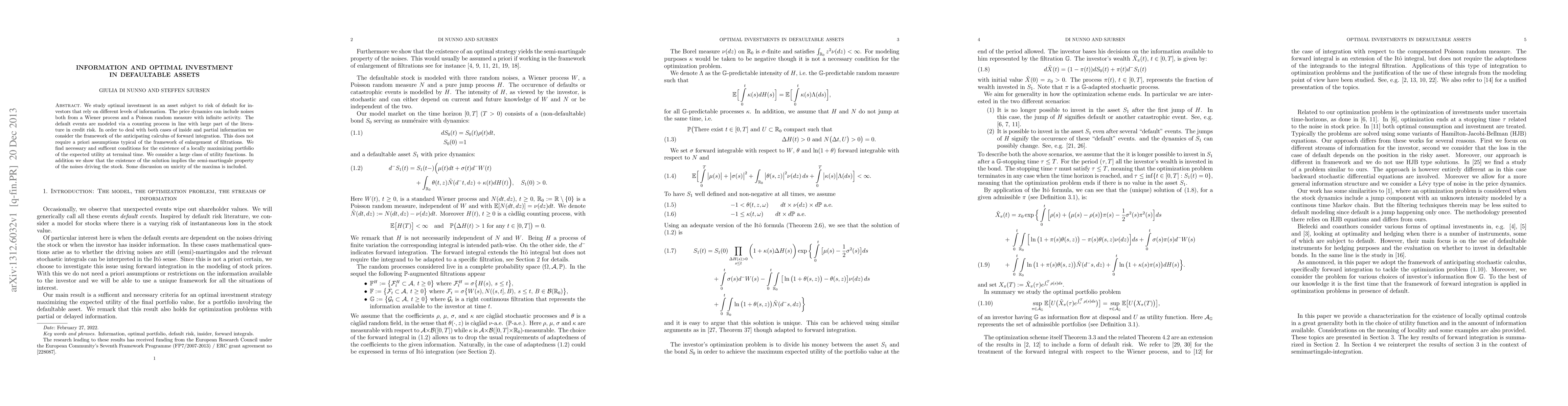 This paper investigates optimal investment strategies for defaultable assets under varying information levels, employing anticipating calculus to handle both inside and partial information. It establishes conditions for the existence of locally maximizing portfolios and discusses the semi-martingale property of asset price noises.