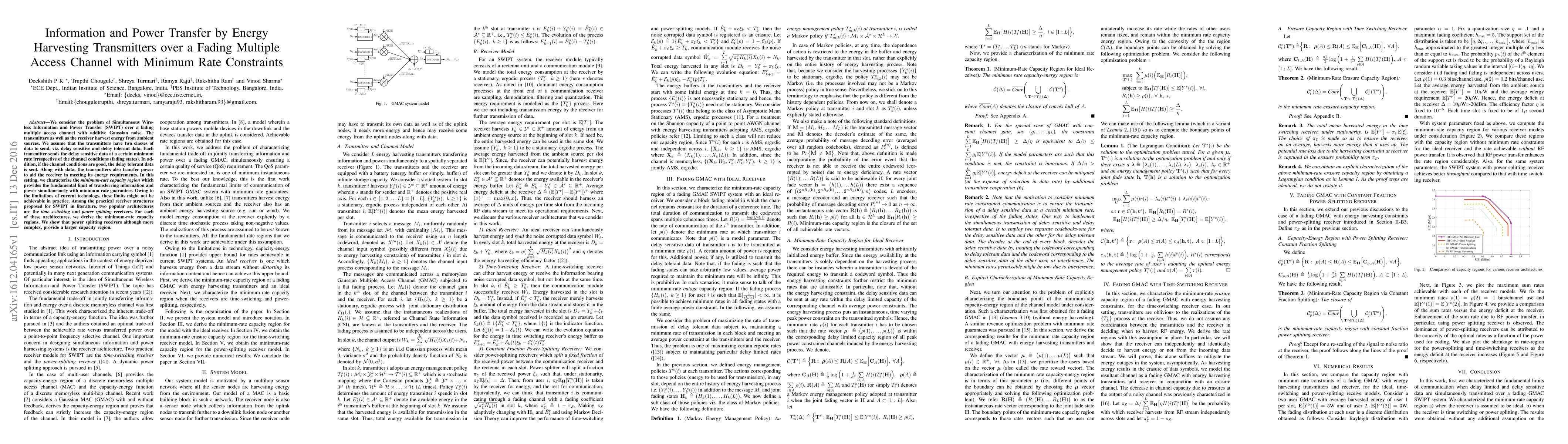 We consider the problem of Simultaneous Wireless Information and Power Transfer (SWIPT) over a fading multiple access channel with additive Gaussian noise. The transmitters as well as the receiver harvest energy from ambient sources. We assume that the transmitters have two classes of data to send, viz. delay sensitive and delay tolerant data. Each transmitter sends the delay sensitive data at a certain minimum rate irrespective of the channel conditions (fading states). In addition, if the channel conditions are good, the delay tolerant data is sent. {Along with data, the transmitters also transfer power to aid the receiver in meeting its energy requirements.} In this setting, we characterize the \textit{minimum-rate capacity region} which provides the fundamental limit of transferring information and power simultaneously with minimum rate guarantees. Owing to the limitations of current technology, these limits might not be achievable in practice. Among the practical receiver structures proposed for SWIPT in literature, two popular architectures are the \textit{time switching} and \textit{power splitting} receivers. For each of these architectures, we derive the minimum-rate capacity regions. We show that power splitting receivers although more complex, provide a larger capacity region.