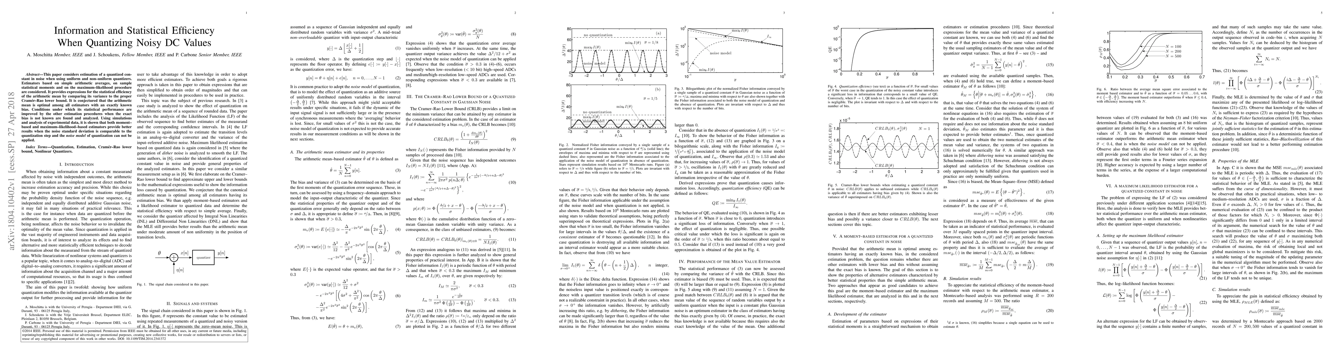 This paper considers estimation of a quantized constant in noise when using uniform and nonuniform quantizers. Estimators based on simple arithmetic averages, on sample statistical moments and on the maximum-likelihood procedure are considered. It provides expressions for the statistical efficiency of the arithmetic mean by comparing its variance to the proper Cram\'er-Rao lower bound. It is conjectured that the arithmetic mean is optimal among all estimators with an exactly known bias. Conditions under which its statistical performance are improved by the other estimation procedures when the exact bias is not known are found and analyzed. Using simulations and analysis of experimental data, it is shown that both moment-based and maximum-likelihood-based estimators provide better results, when the noise standard deviation is comparable with the quantization step and the noise model of quantization can not be applied.