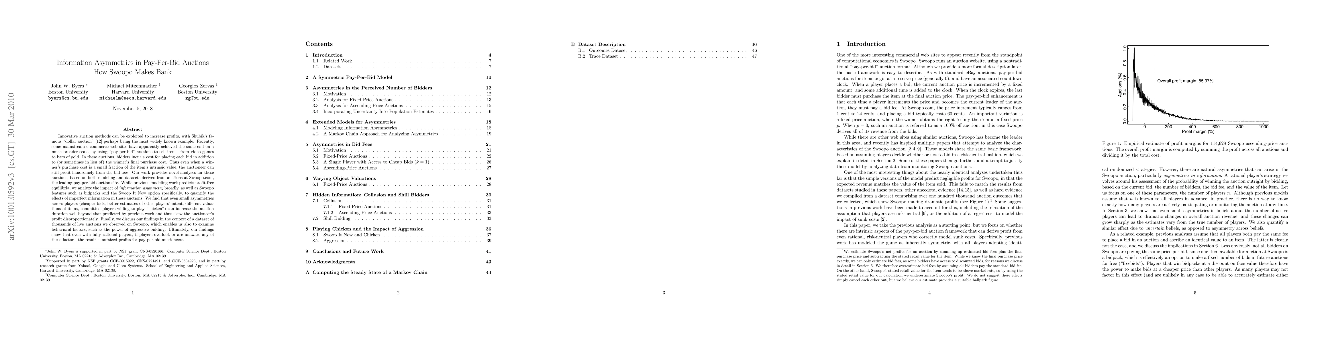 Innovative auction methods can be exploited to increase profits, with Shubik's famous "dollar auction" perhaps being the most widely known example. Recently, some mainstream e-commerce web sites have apparently achieved the same end on a much broader scale, by using "pay-per-bid" auctions to sell items, from video games to bars of gold. In these auctions, bidders incur a cost for placing each bid in addition to (or sometimes in lieu of) the winner's final purchase cost. Thus even when a winner's purchase cost is a small fraction of the item's intrinsic value, the auctioneer can still profit handsomely from the bid fees. Our work provides novel analyses for these auctions, based on both modeling and datasets derived from auctions at Swoopo.com, the leading pay-per-bid auction site. While previous modeling work predicts profit-free equilibria, we analyze the impact of information asymmetry broadly, as well as Swoopo features such as bidpacks and the Swoop It Now option specifically, to quantify the effects of imperfect information in these auctions. We find that even small asymmetries across players (cheaper bids, better estimates of other players' intent, different valuations of items, committed players willing to play "chicken") can increase the auction duration well beyond that predicted by previous work and thus skew the auctioneer's profit disproportionately. Finally, we discuss our findings in the context of a dataset of thousands of live auctions we observed on Swoopo, which enables us also to examine behavioral factors, such as the power of aggressive bidding. Ultimately, our findings show that even with fully rational players, if players overlook or are unaware any of these factors, the result is outsized profits for pay-per-bid auctioneers.