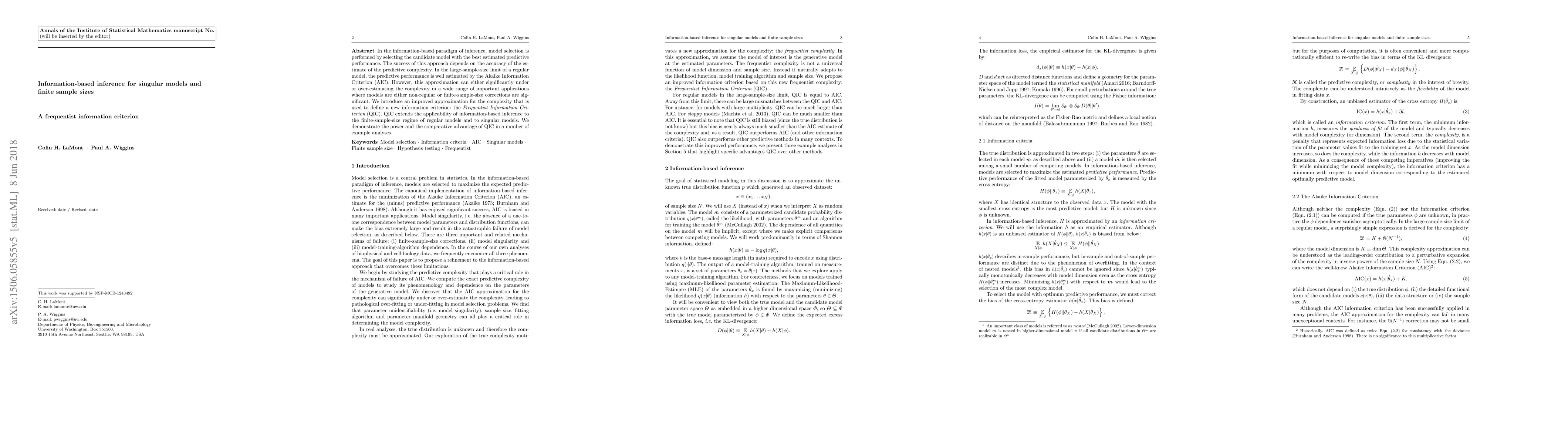In the information-based paradigm of inference, model selection is performed by selecting the candidate model with the best estimated predictive performance. The success of this approach depends on the accuracy of the estimate of the predictive complexity. In the large-sample-size limit of a regular model, the predictive performance is well estimated by the Akaike Information Criterion (AIC). However, this approximation can either significantly under or over-estimating the complexity in a wide range of important applications where models are either non-regular or finite-sample-size corrections are significant. We introduce an improved approximation for the complexity that is used to define a new information criterion: the Frequentist Information Criterion (QIC). QIC extends the applicability of information-based inference to the finite-sample-size regime of regular models and to singular models. We demonstrate the power and the comparative advantage of QIC in a number of example analyses.