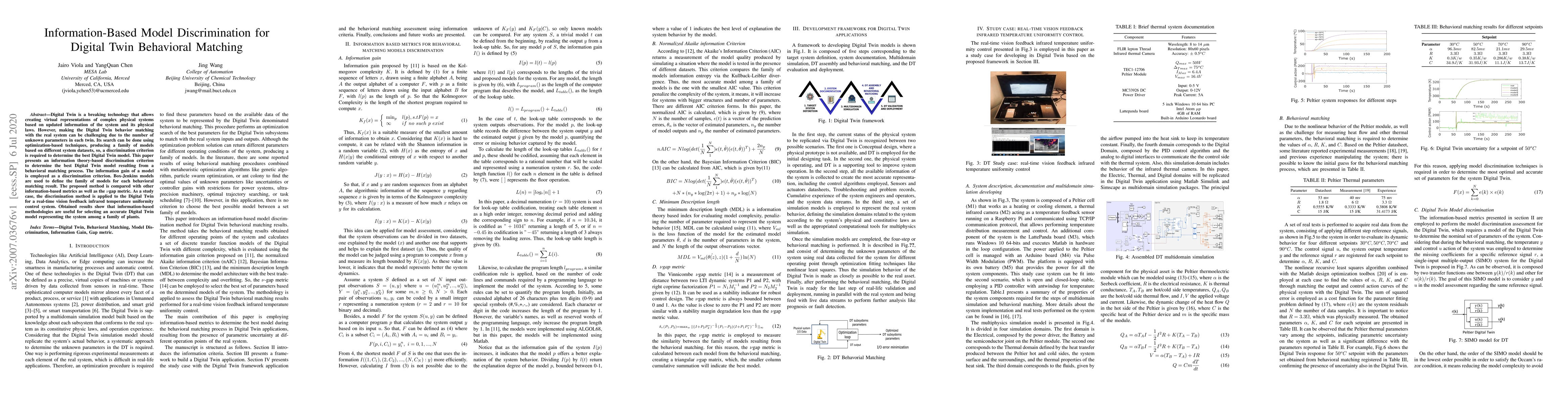 This paper presents an information theory-based discrimination criterion to select the best Digital Twin model from a family of models generated through behavioral matching. The method uses information gain as a criterion and Box-Jenkins models for comparison, demonstrating its effectiveness through a real-time vision feedback infrared temperature uniformity control system.