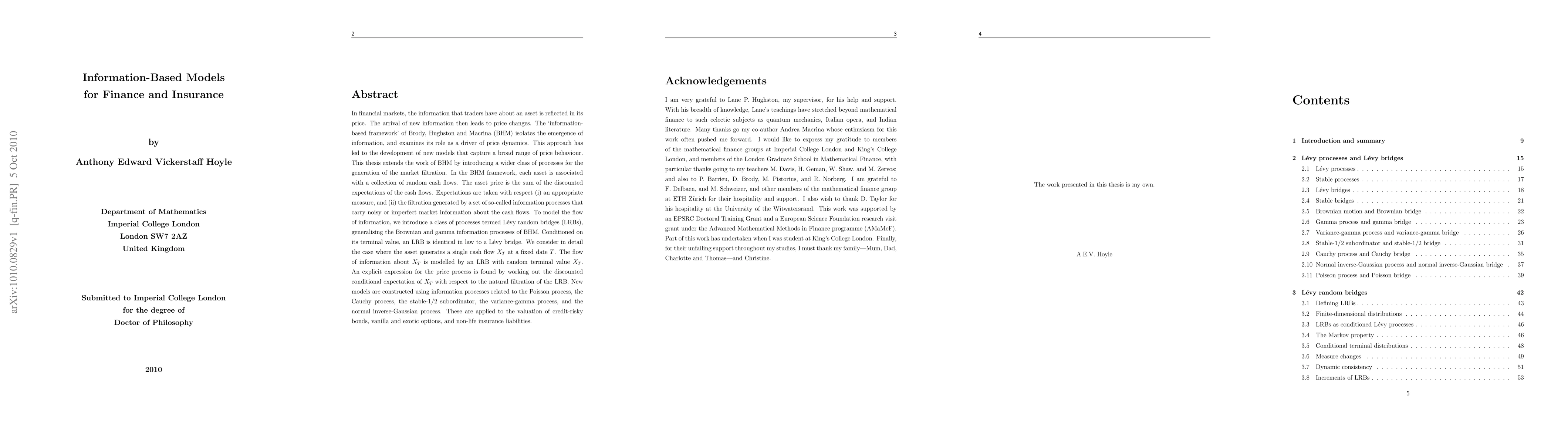 In financial markets, the information that traders have about an asset is reflected in its price. The arrival of new information then leads to price changes. The `information-based framework' of Brody, Hughston and Macrina (BHM) isolates the emergence of information, and examines its role as a driver of price dynamics. This approach has led to the development of new models that capture a broad range of price behaviour. This thesis extends the work of BHM by introducing a wider class of processes for the generation of the market filtration. In the BHM framework, each asset is associated with a collection of random cash flows. The asset price is the sum of the discounted expectations of the cash flows. Expectations are taken with respect (i) an appropriate measure, and (ii) the filtration generated by a set of so-called information processes that carry noisy or imperfect market information about the cash flows. To model the flow of information, we introduce a class of processes termed L\'evy random bridges (LRBs), generalising the Brownian and gamma information processes of BHM. Conditioned on its terminal value, an LRB is identical in law to a L\'evy bridge. We consider in detail the case where the asset generates a single cash flow $X_T$ at a fixed date $T$. The flow of information about $X_T$ is modelled by an LRB with random terminal value $X_T$. An explicit expression for the price process is found by working out the discounted conditional expectation of $X_T$ with respect to the natural filtration of the LRB. New models are constructed using information processes related to the Poisson process, the Cauchy process, the stable-1/2 subordinator, the variance-gamma process, and the normal inverse-Gaussian process. These are applied to the valuation of credit-risky bonds, vanilla and exotic options, and non-life insurance liabilities.