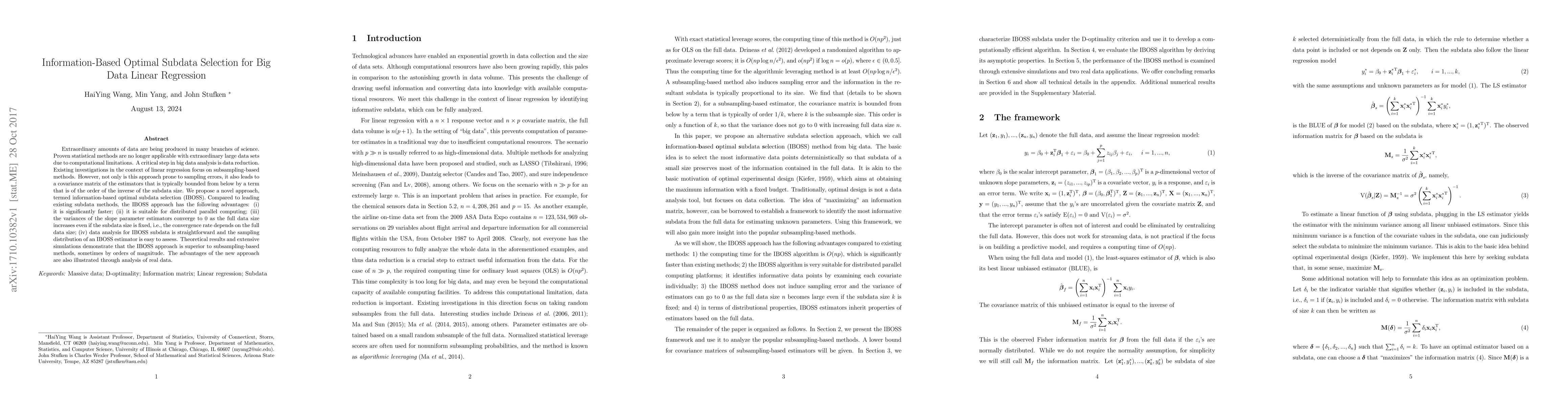 This paper proposes a novel information-based optimal subdata selection (IBOSS) method for big data linear regression, offering significant computational speed, suitability for parallel computing, and improved convergence rates compared to subsampling-based methods. Theoretical results and simulations show that IBOSS outperforms existing subdata methods, especially in large datasets.