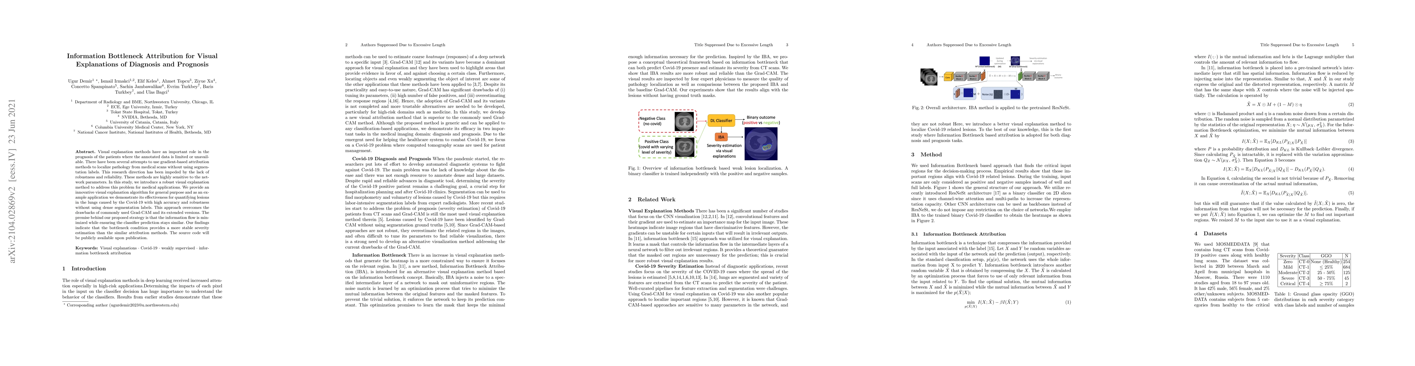 Visual explanation methods have an important role in the prognosis of the patients where the annotated data is limited or unavailable. There have been several attempts to use gradient-based attribution methods to localize pathology from medical scans without using segmentation labels. This research direction has been impeded by the lack of robustness and reliability. These methods are highly sensitive to the network parameters. In this study, we introduce a robust visual explanation method to address this problem for medical applications. We provide an innovative visual explanation algorithm for general purpose and as an example application, we demonstrate its effectiveness for quantifying lesions in the lungs caused by the Covid-19 with high accuracy and robustness without using dense segmentation labels. This approach overcomes the drawbacks of commonly used Grad-CAM and its extended versions. The premise behind our proposed strategy is that the information flow is minimized while ensuring the classifier prediction stays similar. Our findings indicate that the bottleneck condition provides a more stable severity estimation than the similar attribution methods.