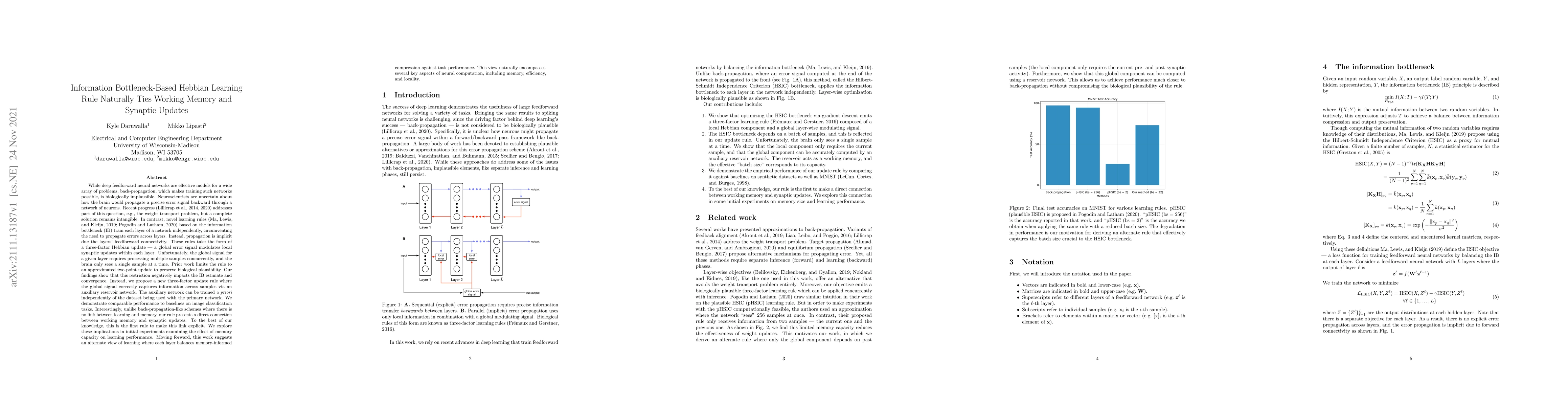 This paper proposes a Hebbian learning rule based on the information bottleneck that ties working memory to synaptic updates in spiking neural networks, avoiding biologically implausible components of back-propagation. The rule decomposes weight updates into a local Hebbian component and a global modulatory signal learned via a working memory reservoir, demonstrating a biologically plausible mechanism for coupling memory and learning.