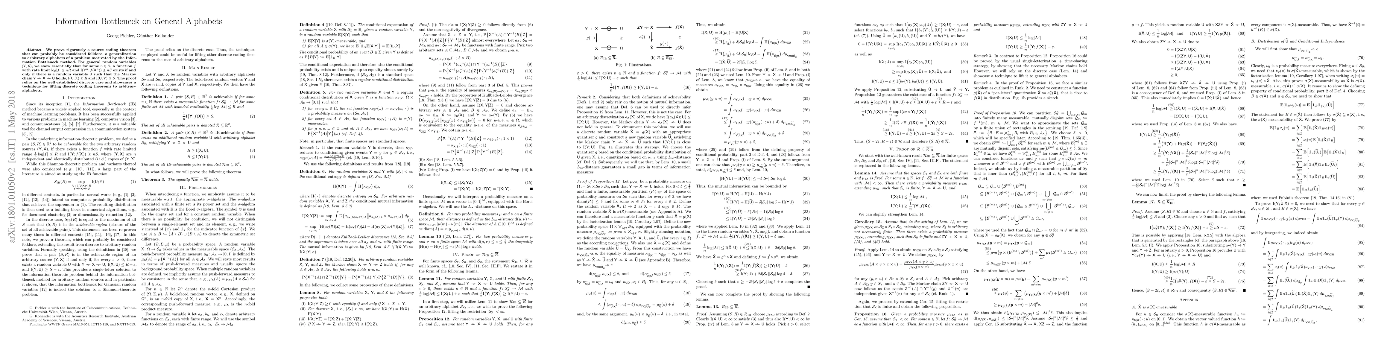 The paper proves a source coding theorem for arbitrary alphabets, generalizing a problem motivated by the Information Bottleneck method. It uses a technique to lift discrete coding theorems to arbitrary alphabets, relying on the well-established discrete case.