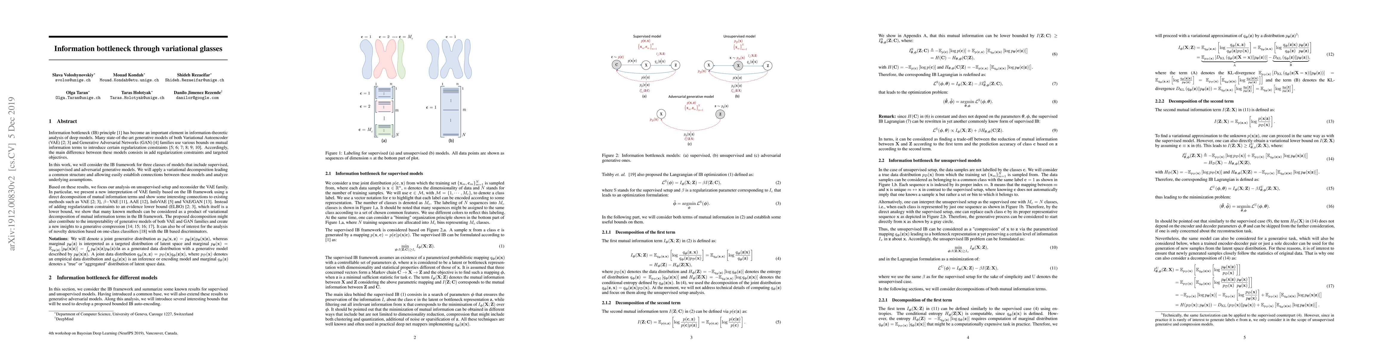 Information bottleneck (IB) principle [1] has become an important element in information-theoretic analysis of deep models. Many state-of-the-art generative models of both Variational Autoencoder (VAE) [2; 3] and Generative Adversarial Networks (GAN) [4] families use various bounds on mutual information terms to introduce certain regularization constraints [5; 6; 7; 8; 9; 10]. Accordingly, the main difference between these models consists in add regularization constraints and targeted objectives. In this work, we will consider the IB framework for three classes of models that include supervised, unsupervised and adversarial generative models. We will apply a variational decomposition leading a common structure and allowing easily establish connections between these models and analyze underlying assumptions. Based on these results, we focus our analysis on unsupervised setup and reconsider the VAE family. In particular, we present a new interpretation of VAE family based on the IB framework using a direct decomposition of mutual information terms and show some interesting connections to existing methods such as VAE [2; 3], beta-VAE [11], AAE [12], InfoVAE [5] and VAE/GAN [13]. Instead of adding regularization constraints to an evidence lower bound (ELBO) [2; 3], which itself is a lower bound, we show that many known methods can be considered as a product of variational decomposition of mutual information terms in the IB framework. The proposed decomposition might also contribute to the interpretability of generative models of both VAE and GAN families and create a new insights to a generative compression [14; 15; 16; 17]. It can also be of interest for the analysis of novelty detection based on one-class classifiers [18] with the IB based discriminators.