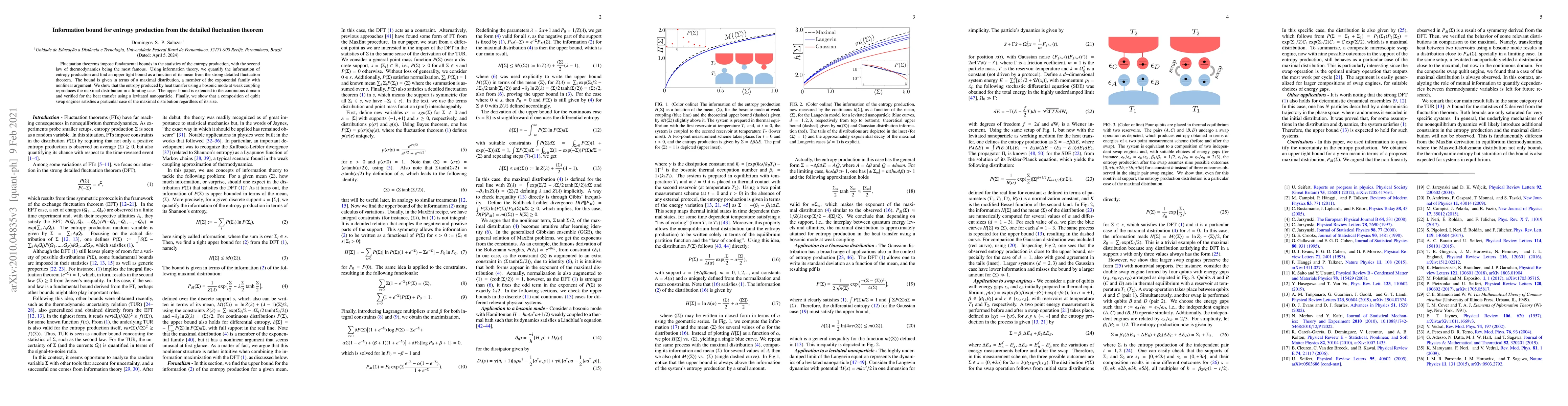 This paper quantifies the information bound for entropy production using the strong detailed fluctuation theorem, establishing an upper bound in terms of a maximal distribution from the exponential family. The bound is verified for heat transfer in bosonic modes and levitated nanoparticles, and shown to apply to qubit swap engines.