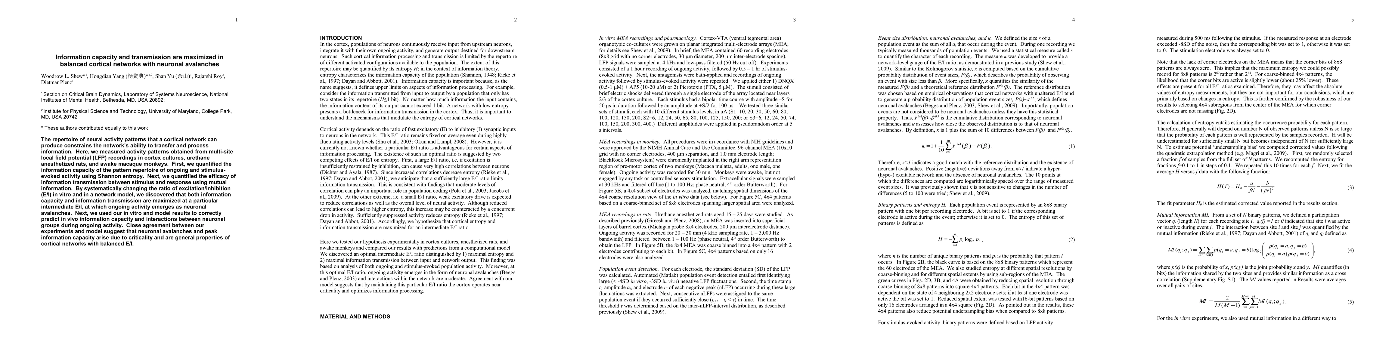 This study finds that balanced cortical networks with intermediate excitation/inhibition ratios maximize information capacity and transmission, achieved through neuronal avalanches, suggesting criticality as a general property of such networks. Experimental results in cultures, rats, and monkeys align with in vitro findings and network models.