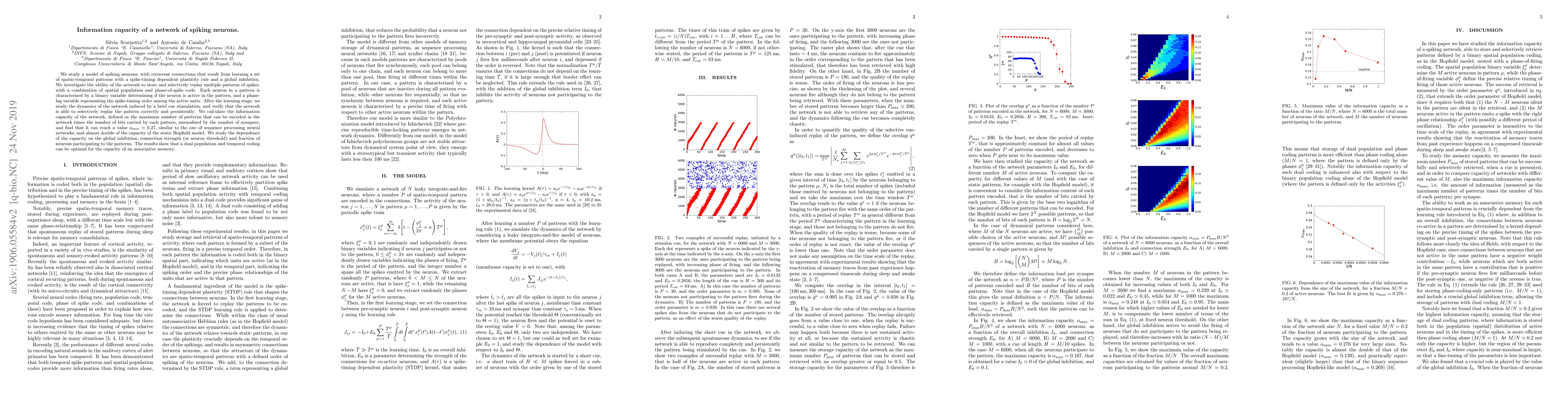We study a model of spiking neurons, with recurrent connections that result from learning a set of spatio-temporal patterns with a spike-timing dependent plasticity rule and a global inhibition. We investigate the ability of the network to store and selectively replay multiple patterns of spikes, with a combination of spatial population and phase-of-spike code. Each neuron in a pattern is characterized by a binary variable determining if the neuron is active in the pattern, and a phase-lag variable representing the spike-timing order among the active units. After the learning stage, we study the dynamics of the network induced by a brief cue stimulation, and verify that the network is able to selectively replay the pattern correctly and persistently. We calculate the information capacity of the network, defined as the maximum number of patterns that can be encoded in the network times the number of bits carried by each pattern, normalized by the number of synapses, and find that it can reach a value $\alpha_\text{max}\simeq 0.27$, similar to the one of sequence processing neural networks, and almost double of the capacity of the static Hopfield model. We study the dependence of the capacity on the global inhibition, connection strength (or neuron threshold) and fraction of neurons participating to the patterns. The results show that a dual population and temporal coding can be optimal for the capacity of an associative memory.