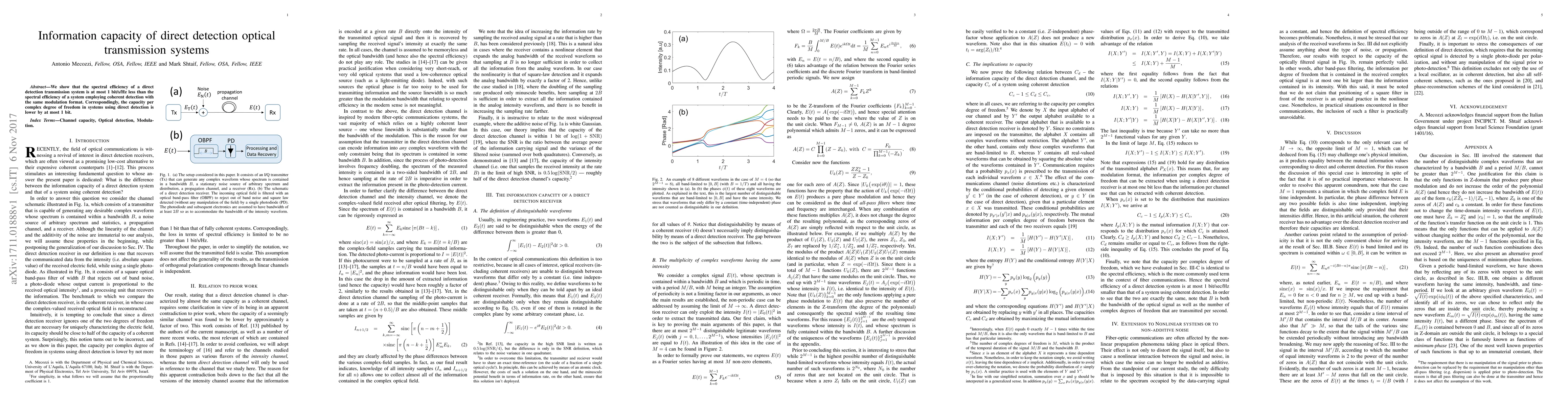 Summary: The research demonstrates that direct detection optical transmission systems achieve a maximum spectral efficiency of 1 bit/s/Hz less than coherent detection systems using the same modulation format, resulting in a lower capacity per complex degree of freedom by at most 1 bit.