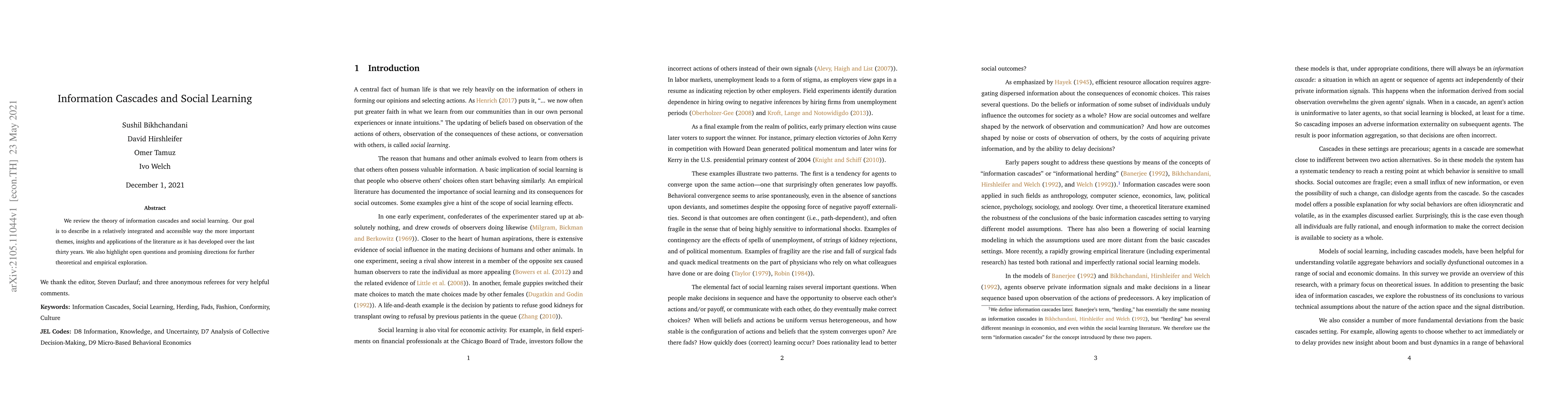 This paper reviews the theory of information cascades and social learning, summarizing key themes and applications from the past thirty years, while also identifying open questions and future research directions. The aim is to present an integrated and accessible overview for both theoretical and empirical advancements in the field.