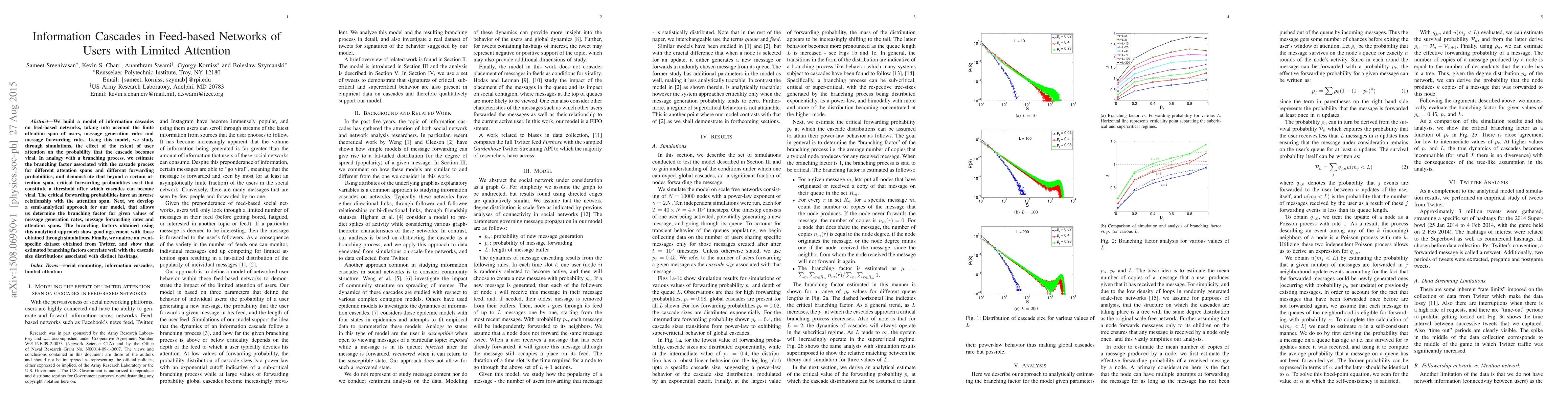 This paper models information cascades on feed-based networks, considering users' limited attention spans. It finds that beyond a certain attention span, critical forwarding probabilities exist that determine whether cascades become viral, with these probabilities inversely related to attention span. The study validates a semi-analytical approach and correlates its findings with Twitter data.